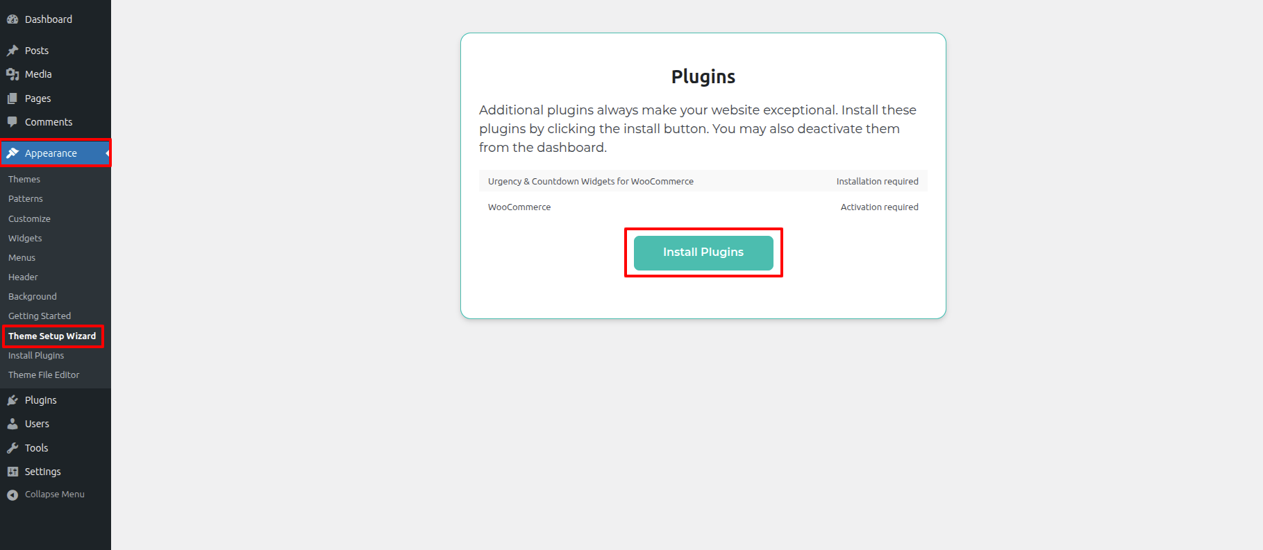 - Hit up the the Dashboard > Appearance > Theme Setup Wizard