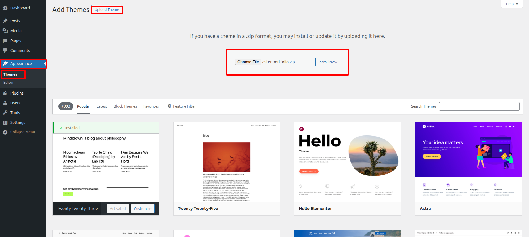 This technique of uploading your theme is something you might want to acknowledge if you have an FTP client installed (like FileZilla) and recognize the login credentials for the server hosting your website.