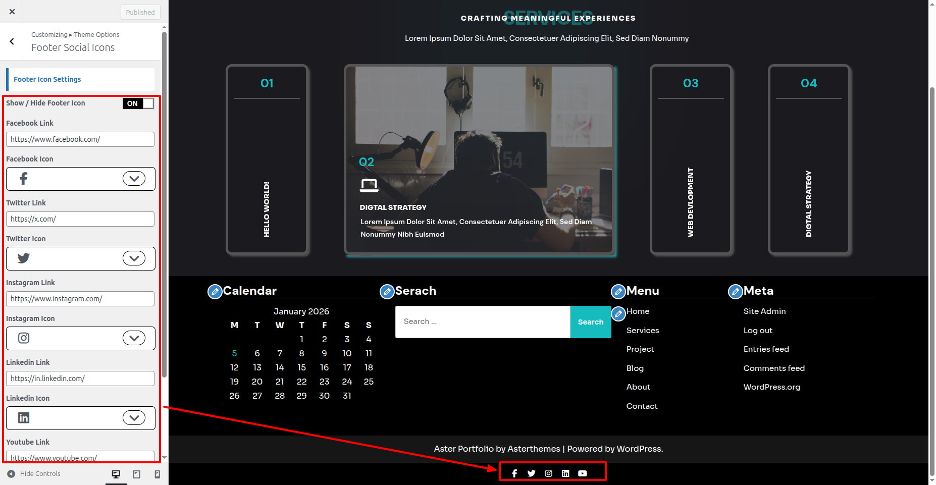 - Hit up the the Dashboard > Appearance > Customize > Theme Options > Footer Social Icons.