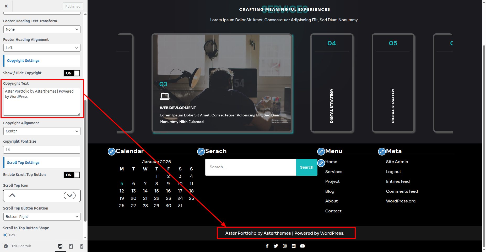 - Hit up the the Dashboard > Appearance > Customize > Theme Options > Footer Options.