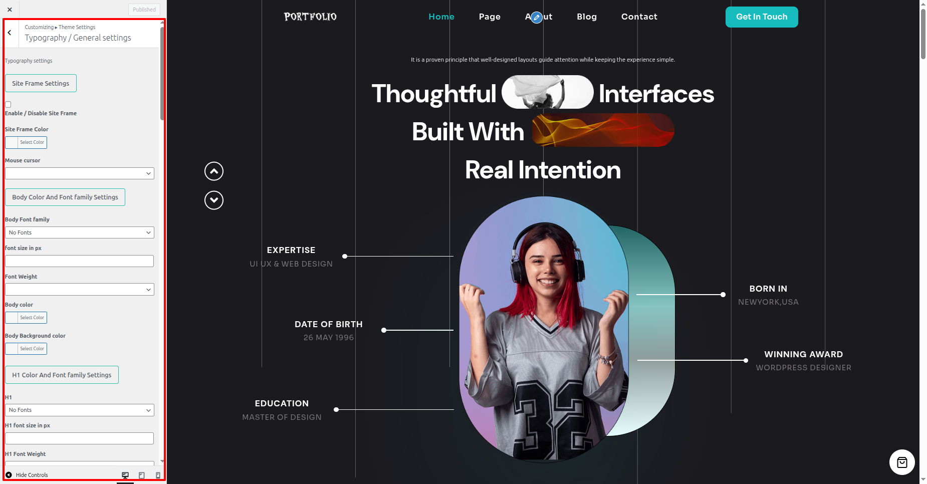 The font family and size of headers, paragraphs, body text, slider text, post/page titles, and button text can all be adjusted.