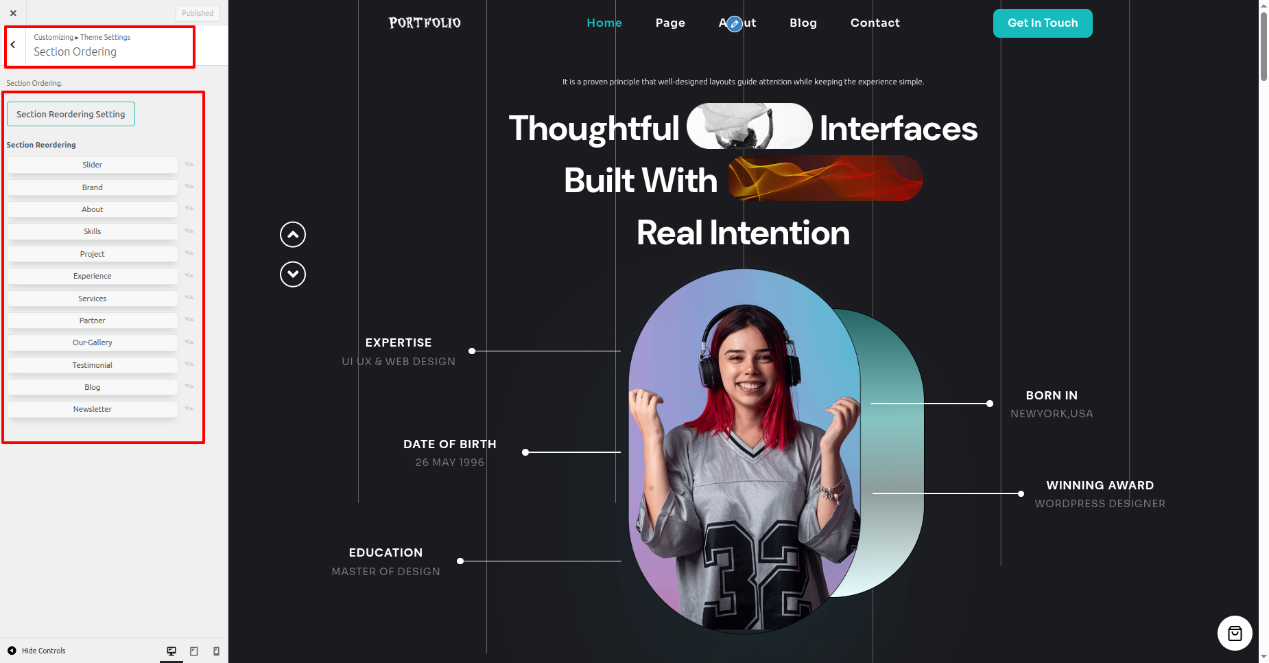 - Proceed to the the Dashboard > Appearance > Customize > Theme Settings > Section Ordering.