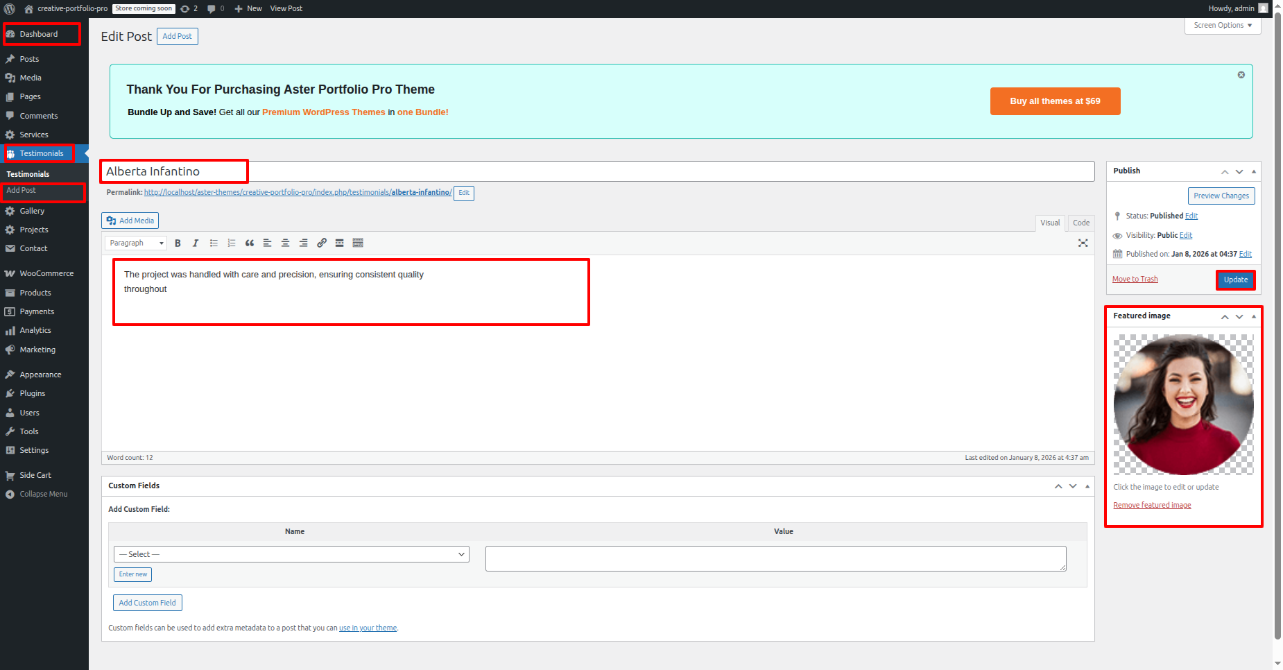 - Proceed to the Dashboard, then go to Testimonial and click Add new post Fill in your details and click Publish button.