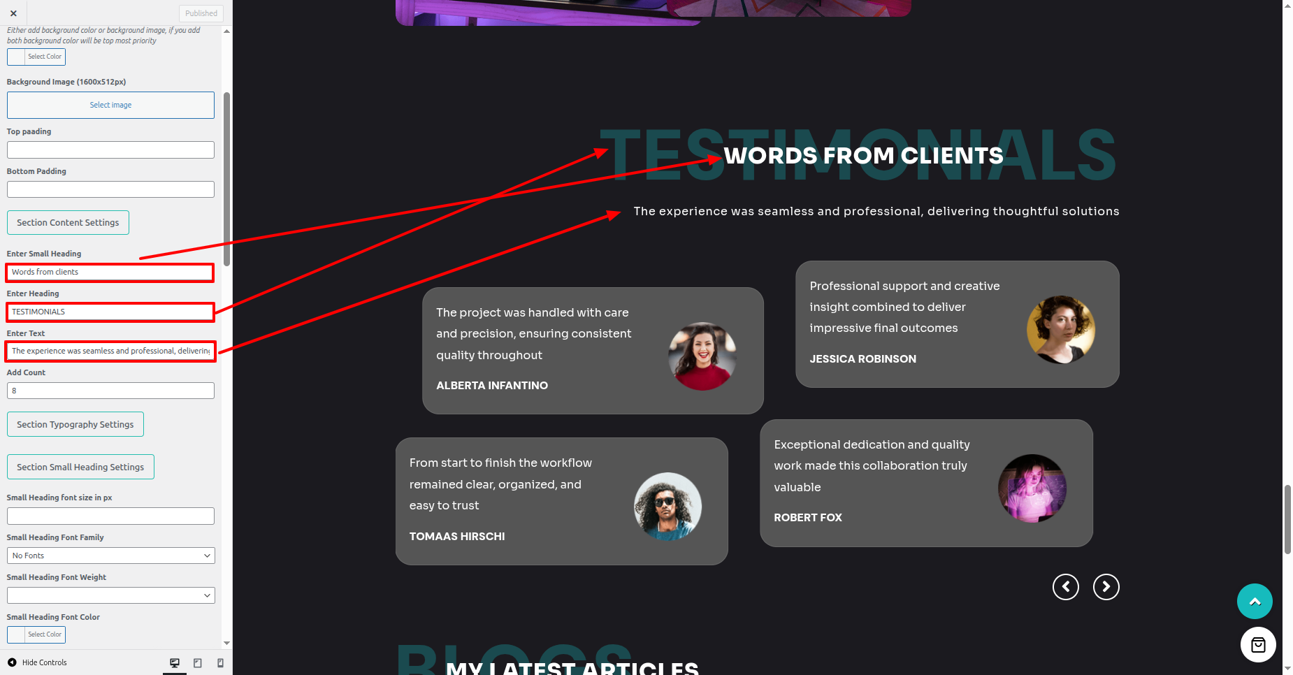 - Proceed to the the Dashboard > Appearance > Customize > Theme Settings > Testimonial Section.