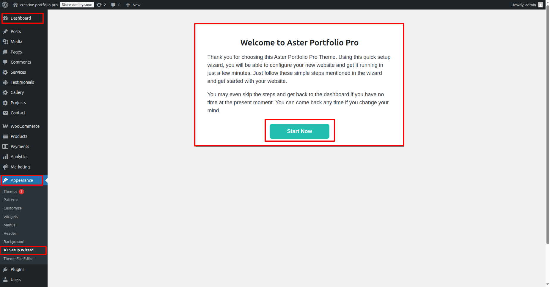 - Proceed to the Dashboard > Appearance in the left-hand menu, and then Click on At Setup Wizard.