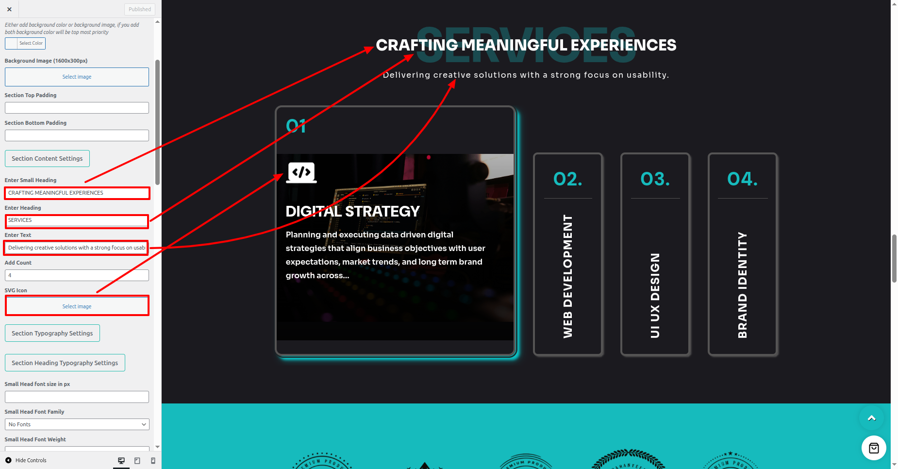 - Proceed to the the Dashboard > Appearance > Customize > Theme Settings > Services Section.