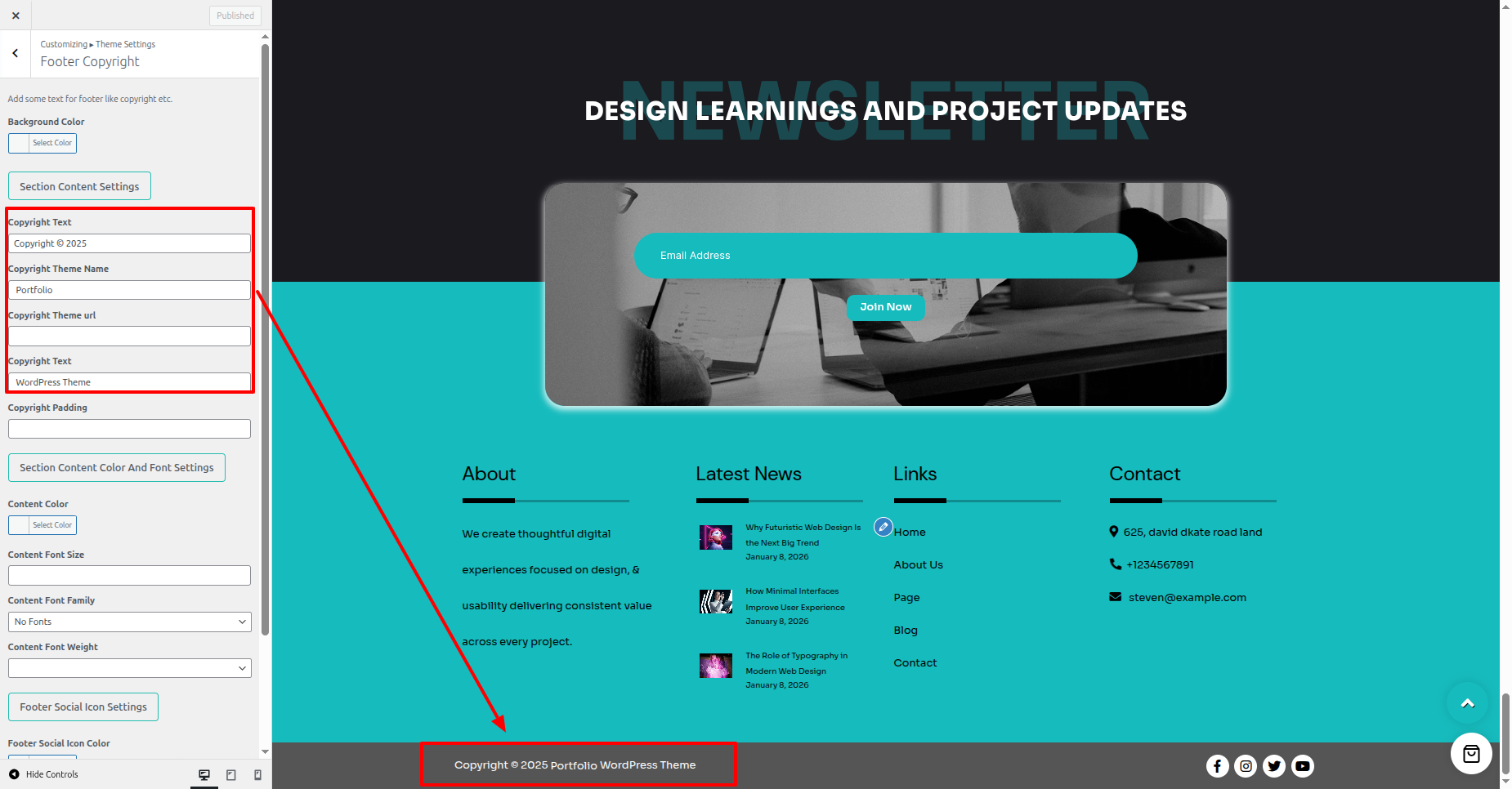 - Proceed to the the Dashboard > Appearance > Customize > Theme Settings > Copyright.