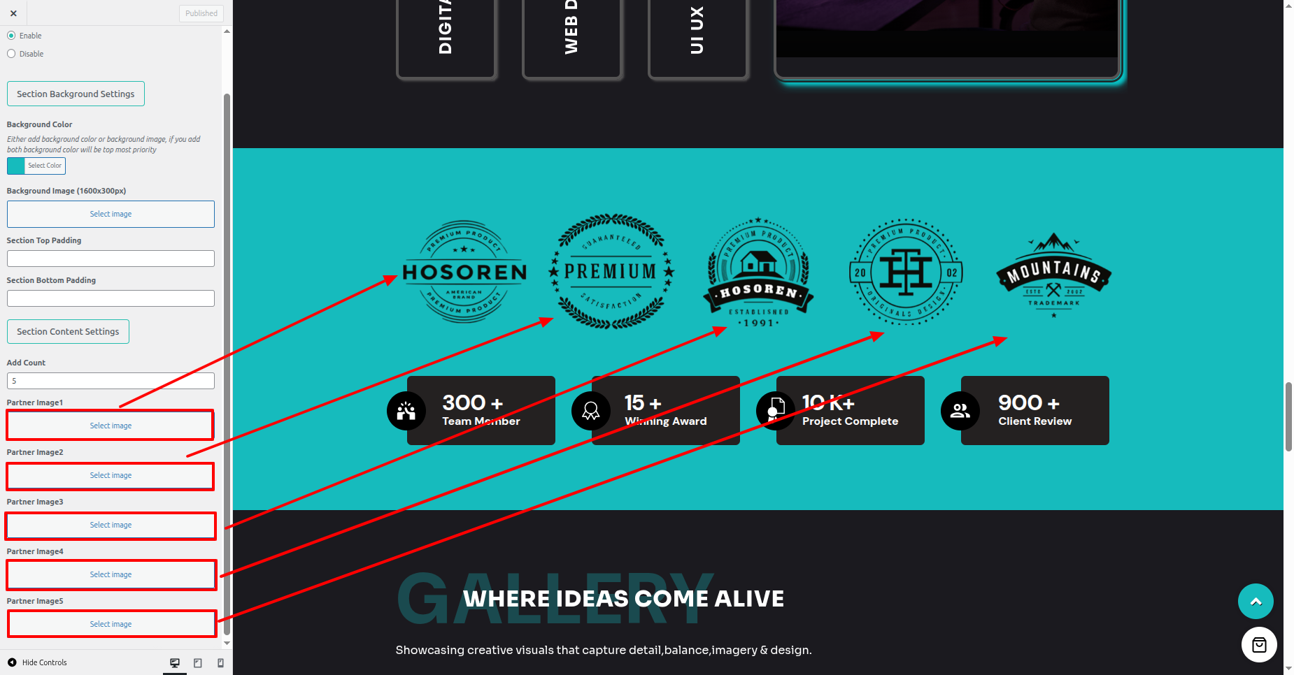 - Proceed to the the Dashboard > Appearance > Customize > Theme Settings > Partner Section.