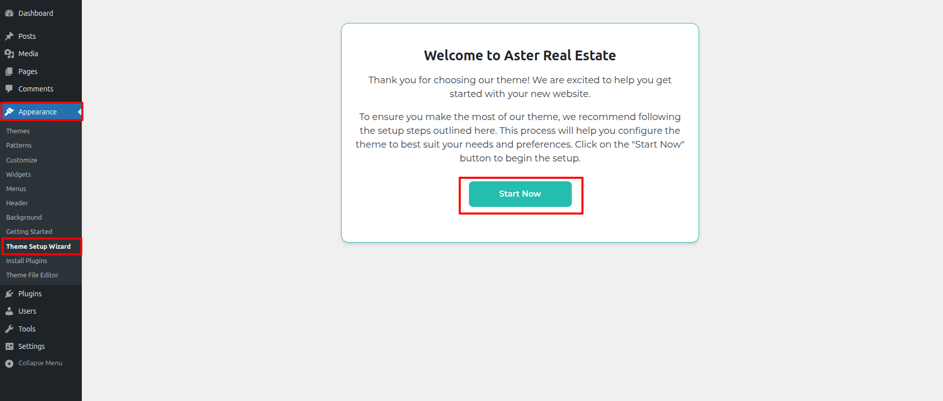 - Hit up the the Dashboard > Appearance > Theme Setup Wizard