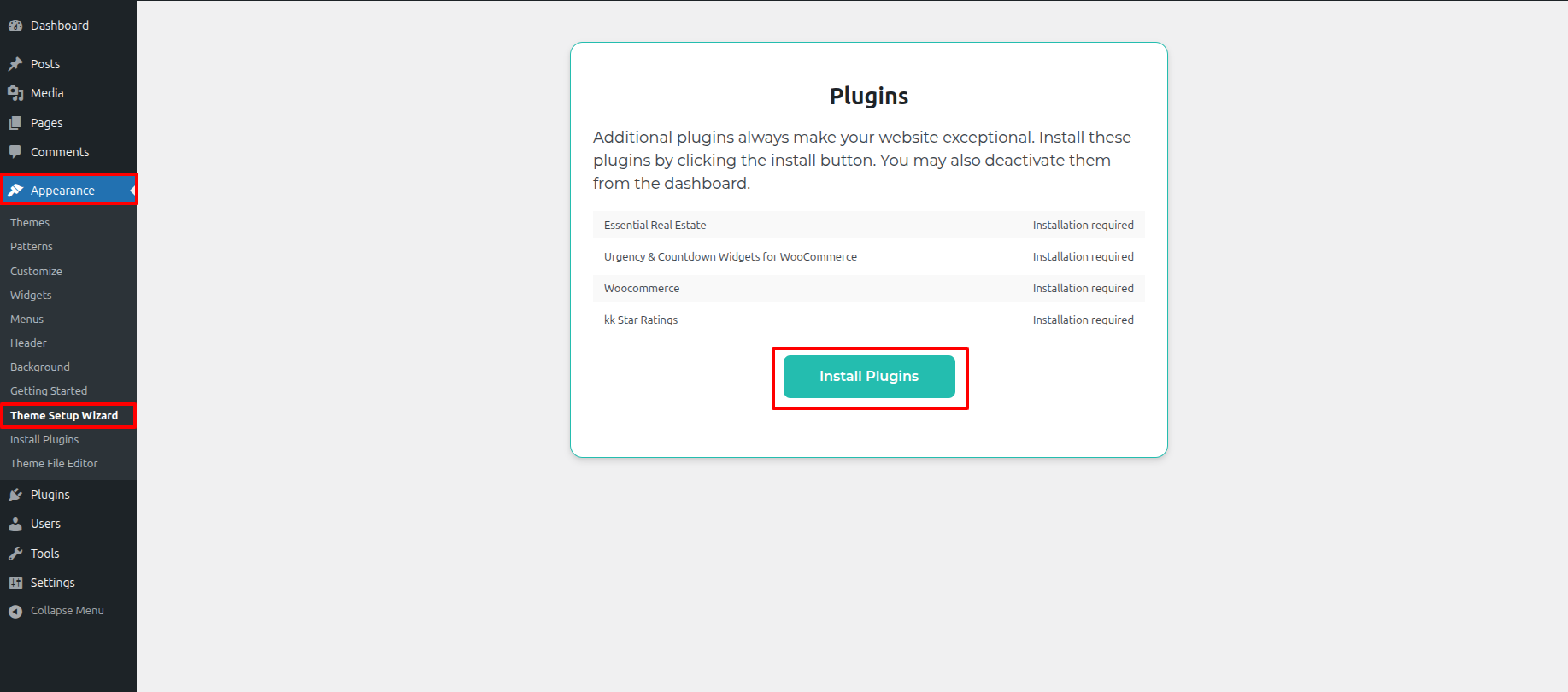 - Hit up the the Dashboard > Appearance > Install Plugins > Install Required Plugins.