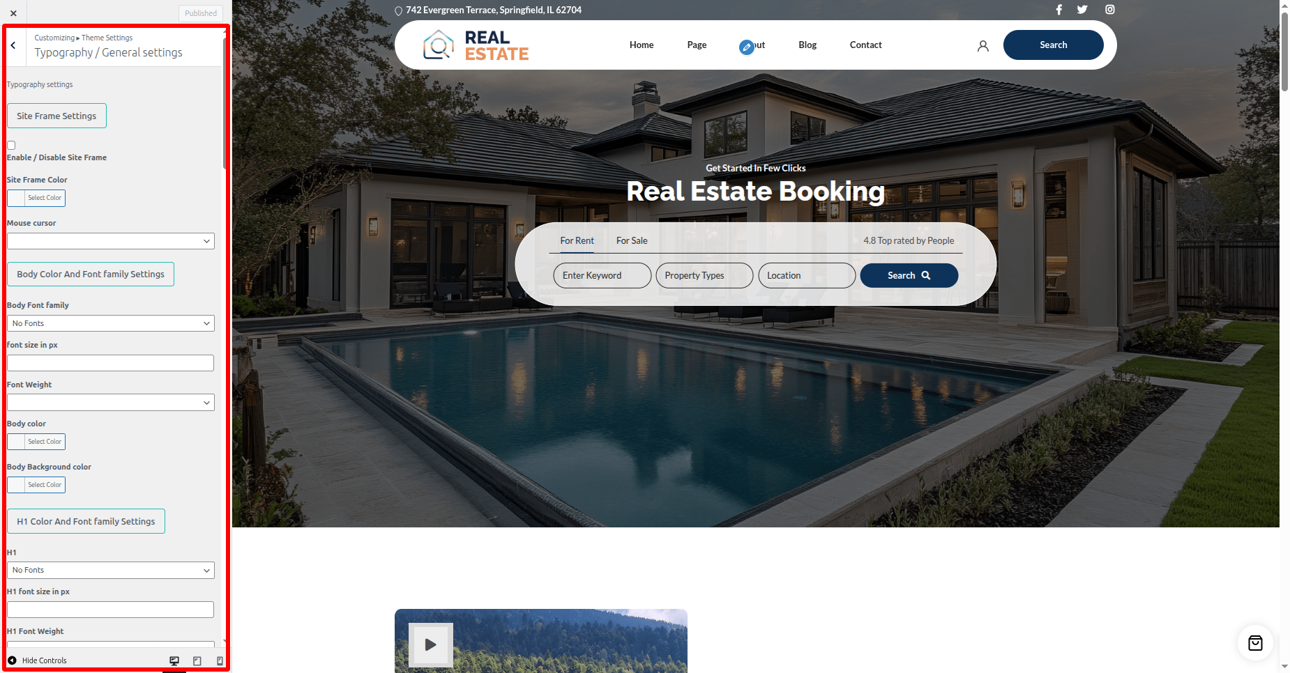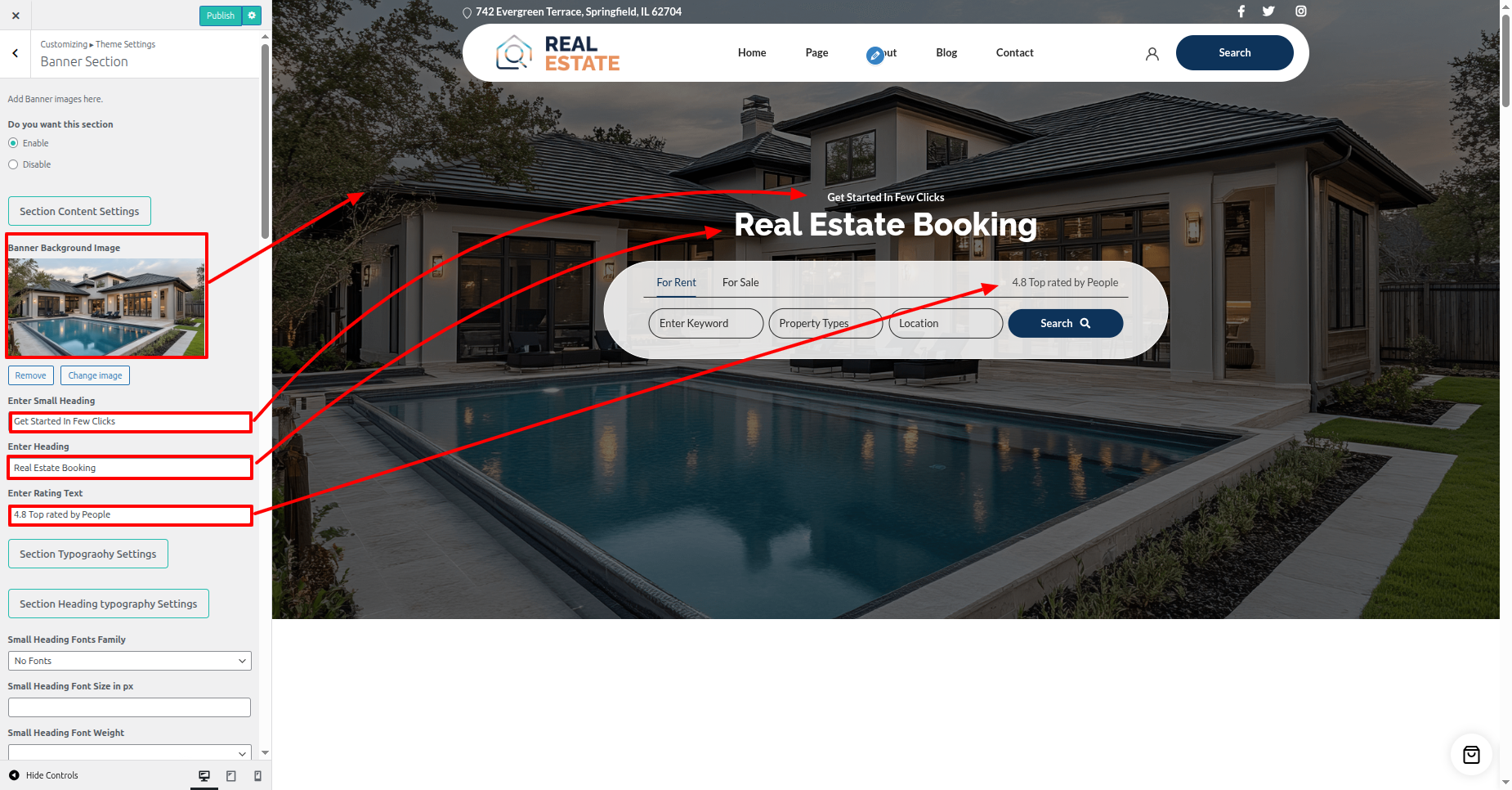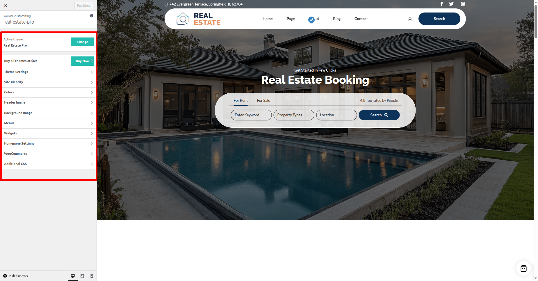 - Proceed to the Dashboard > Appearance > Customize > Theme Settings > Property Section.
