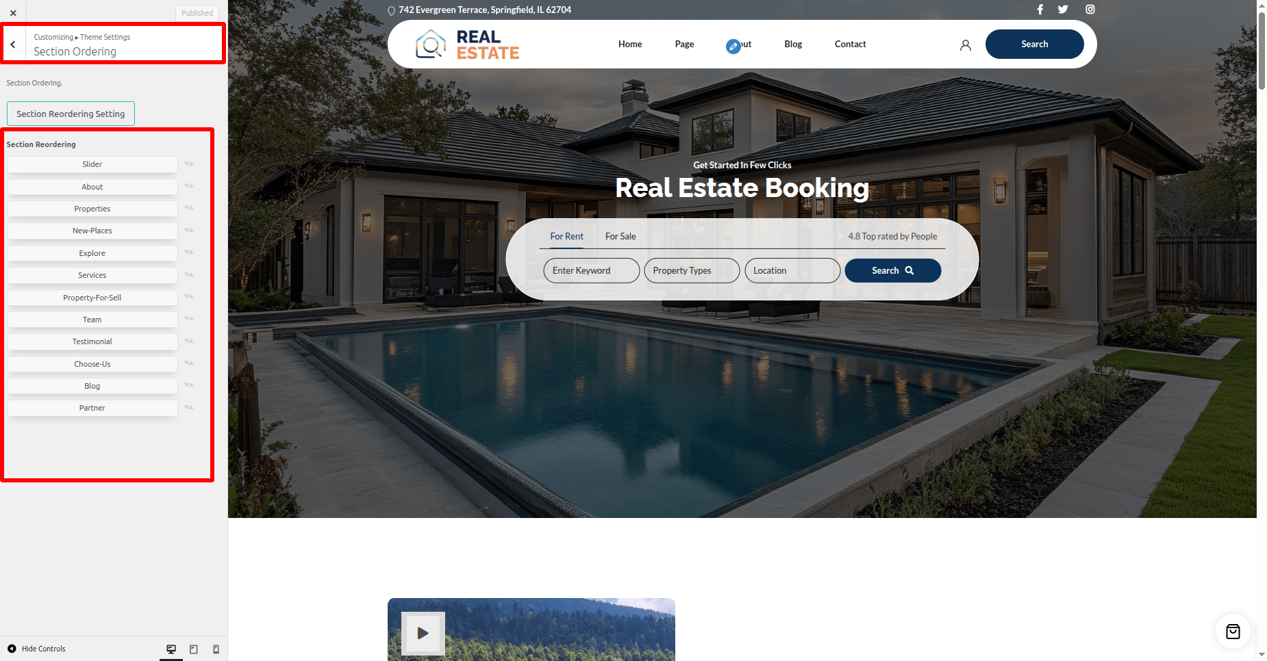 - Proceed to the the Dashboard > Appearance > Customize > Theme Settings > Section Ordering.