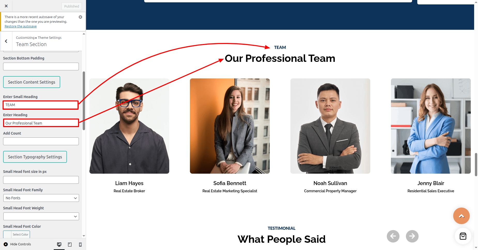 - Proceed to the the Dashboard > Appearance > Customize > Theme Settings > Team Section.