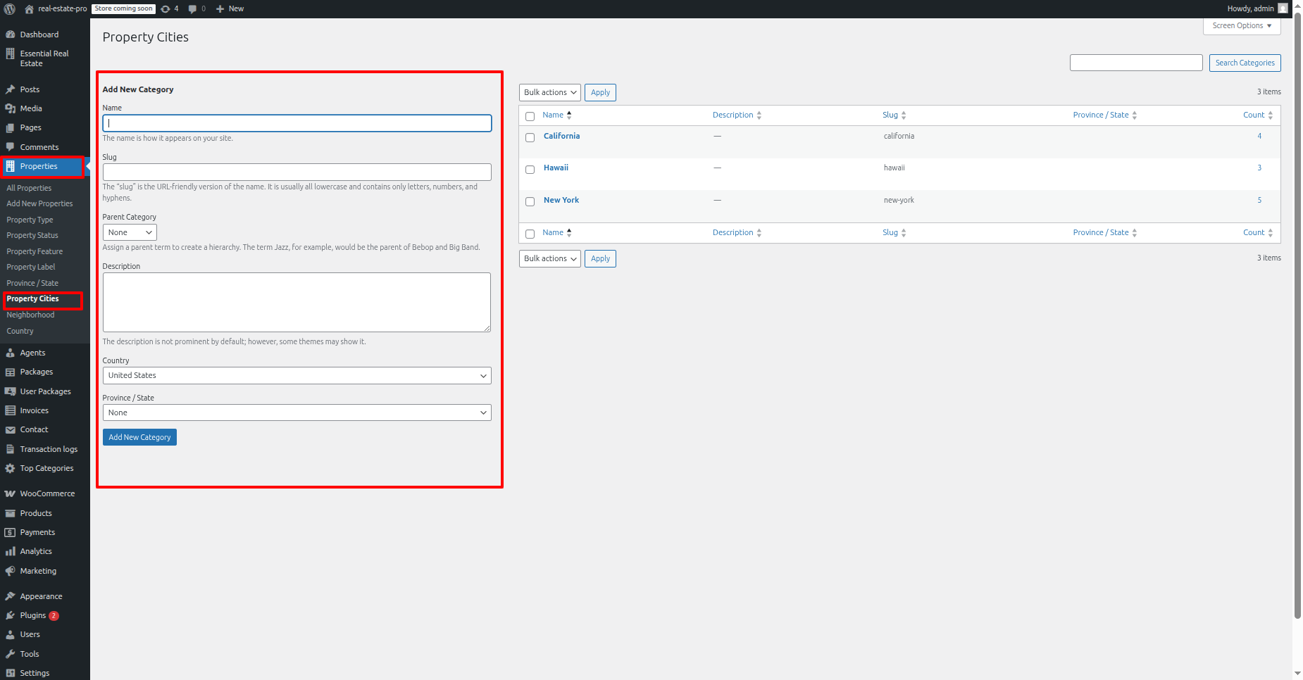 - Proceed to the Dashboard, then go to Properties and click Property Cities Fill in your details and click Add New Category button.