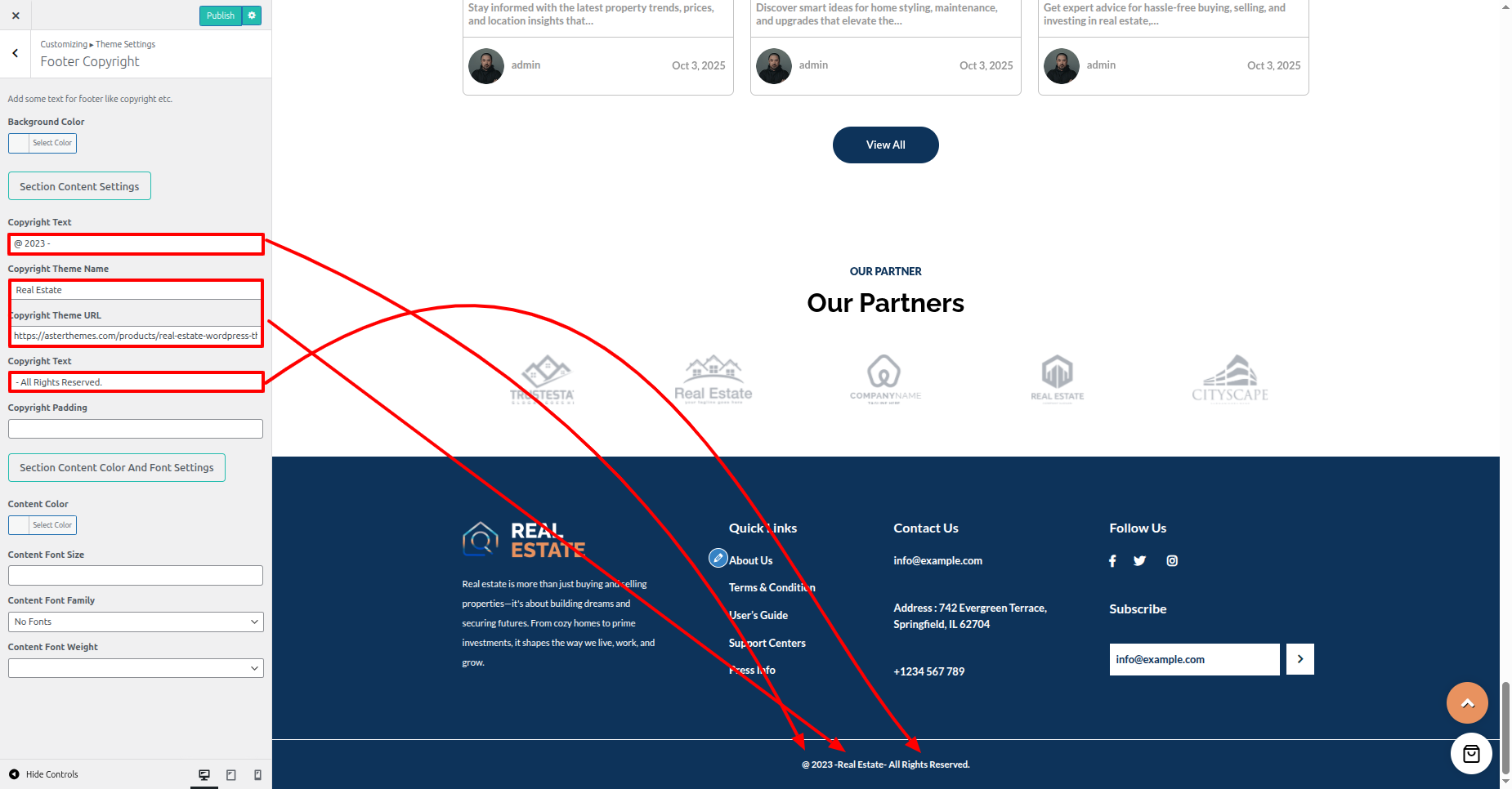 - Proceed to the the Dashboard > Appearance > Customize > Theme Settings > Copyright.