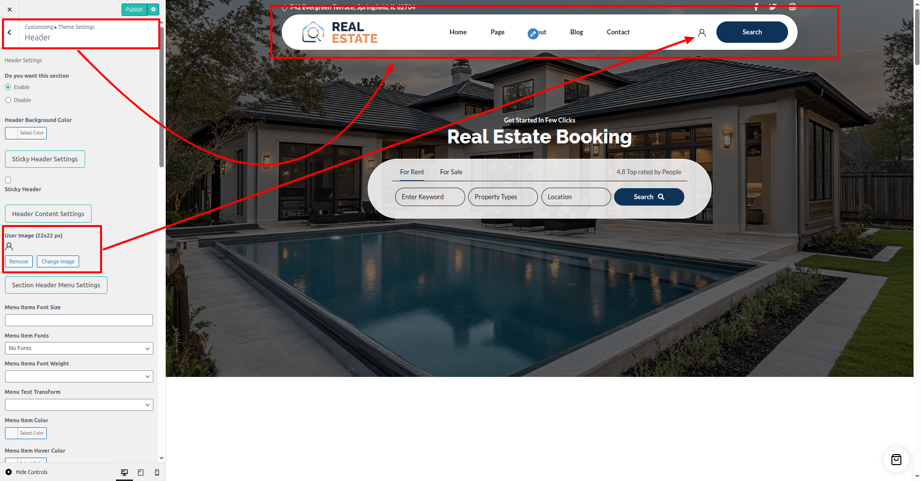- Proceed to the the Dashboard > Appearance > Customize > Theme Settings > Header