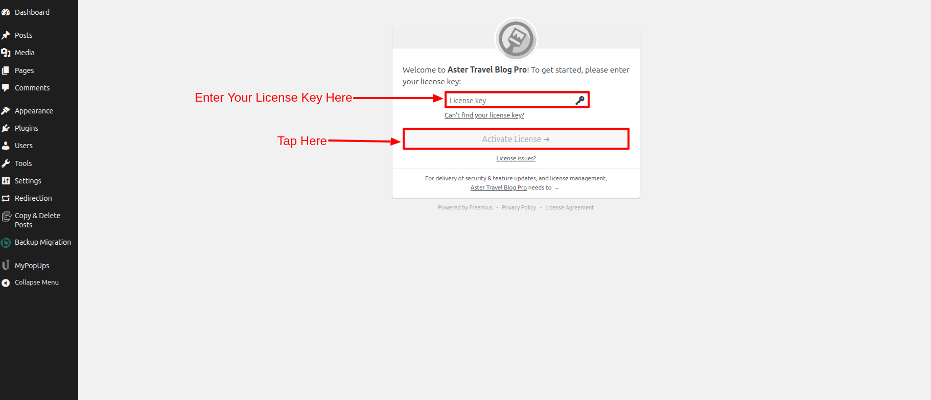 After activating the theme, you'll directly see this page. As you can see, you need to enter the License Key there, then tap to Activate License .