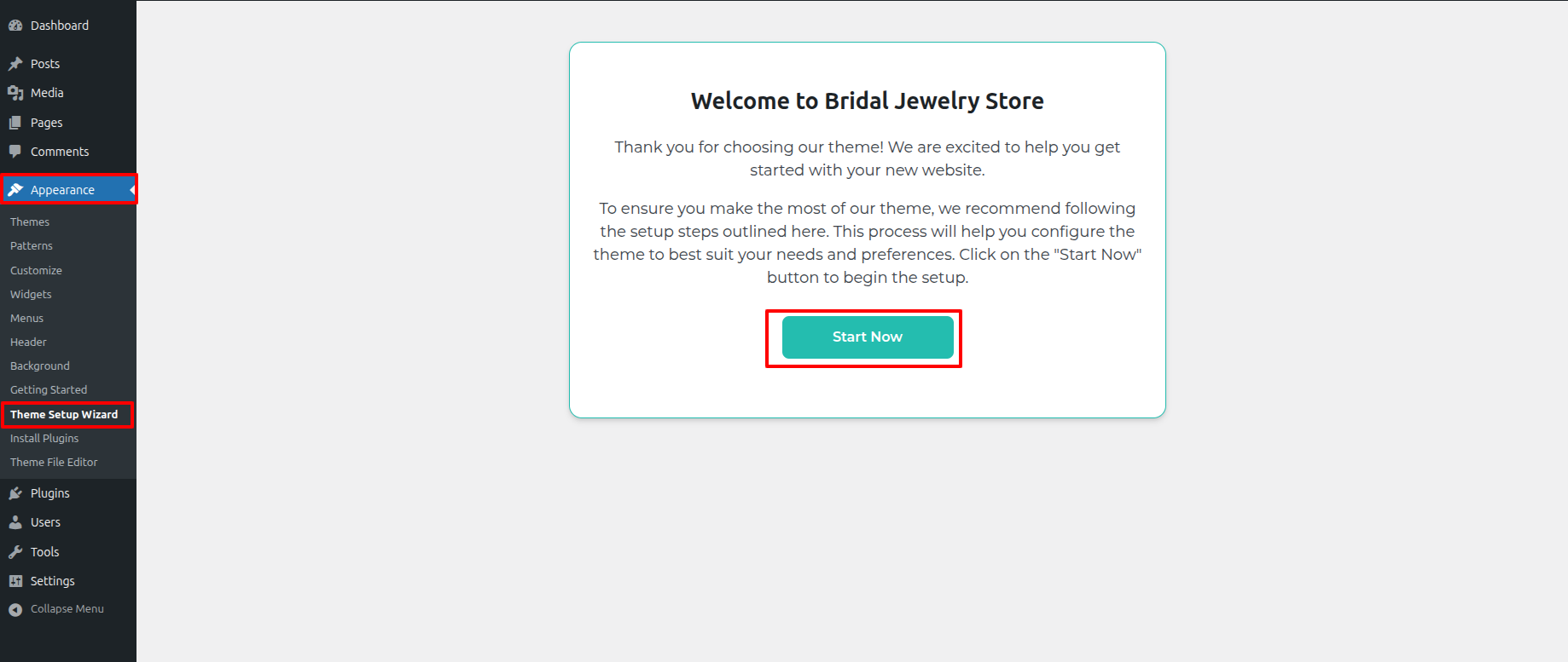- Hit up the the Dashboard > Appearance > Theme Setup Wizard