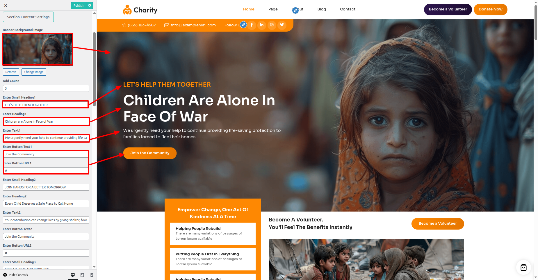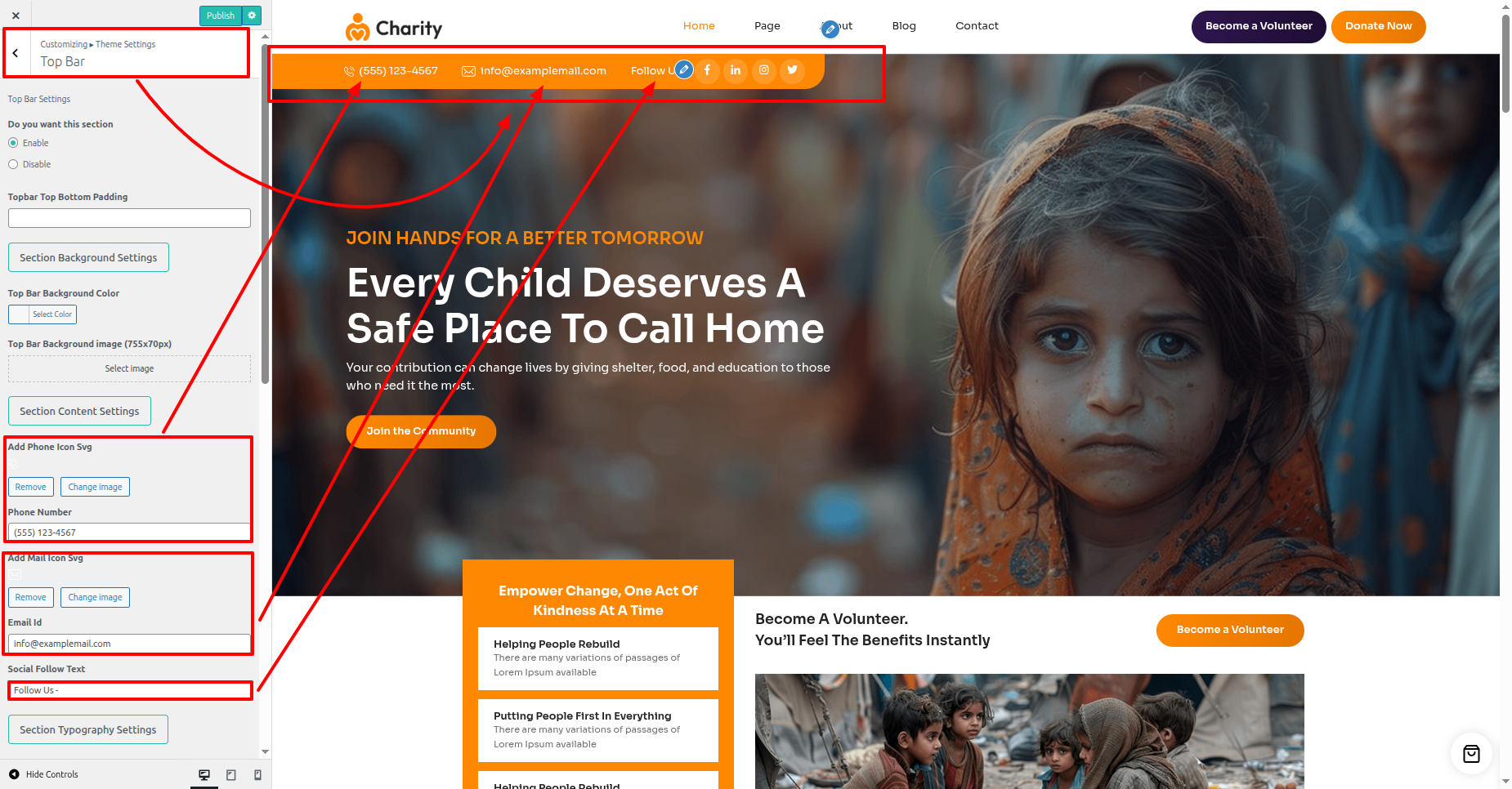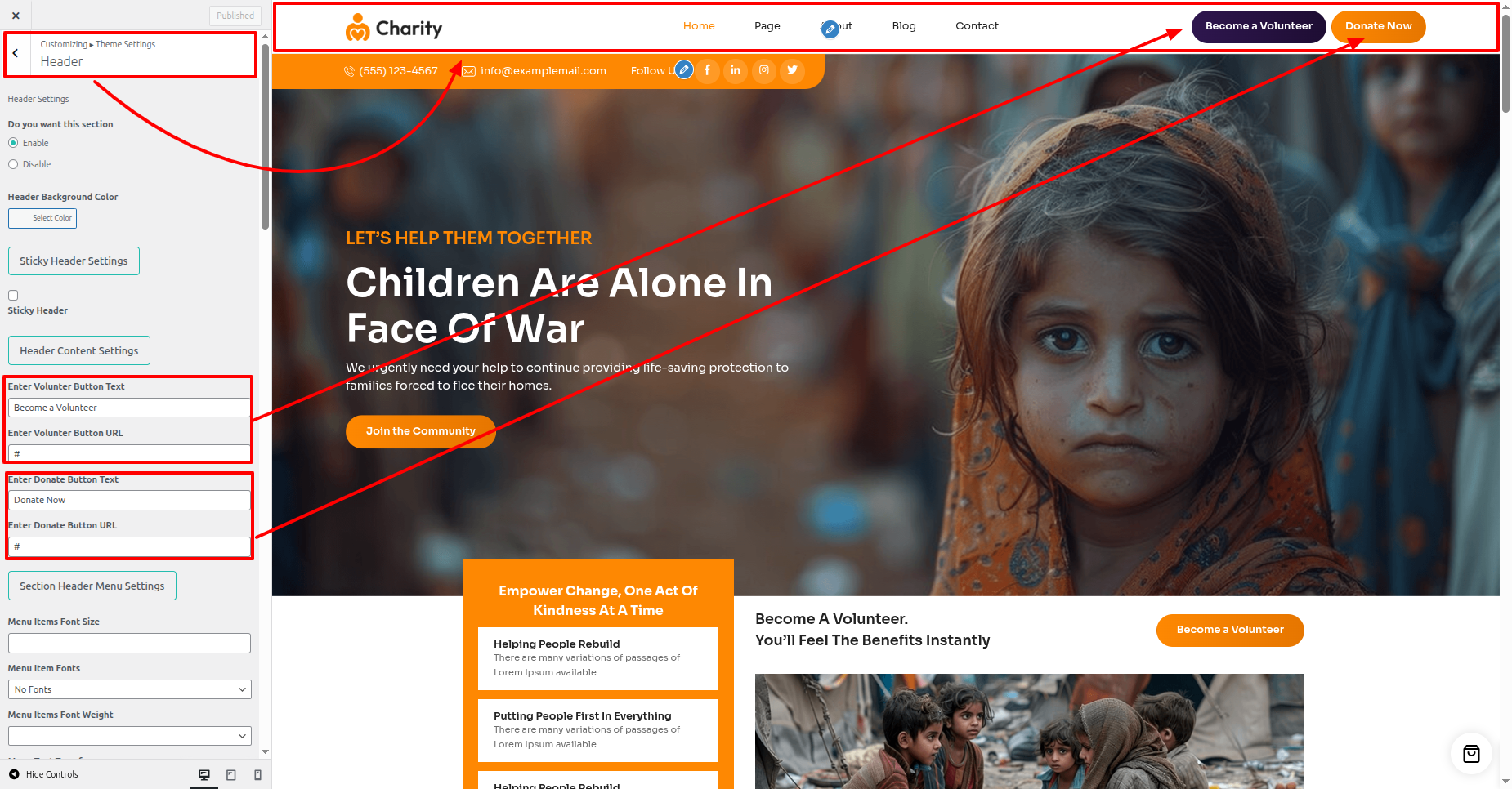 - Proceed to the the Dashboard > Appearance > Customize > Theme Settings > Become Volunteer Section.