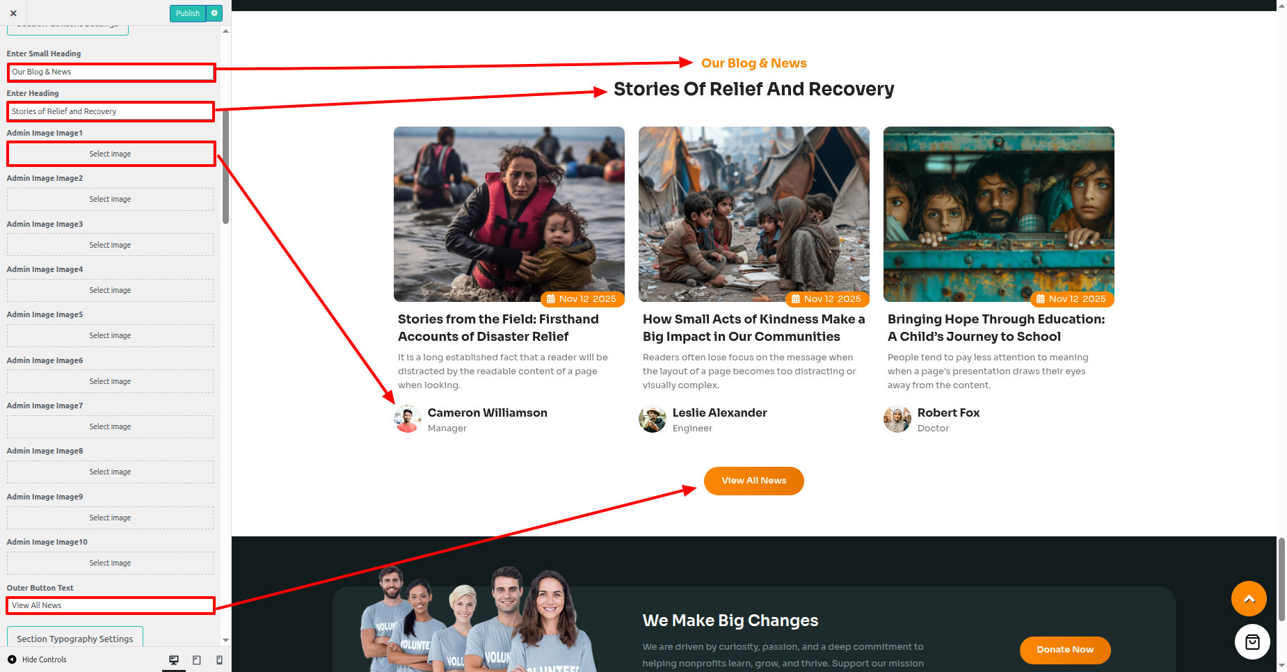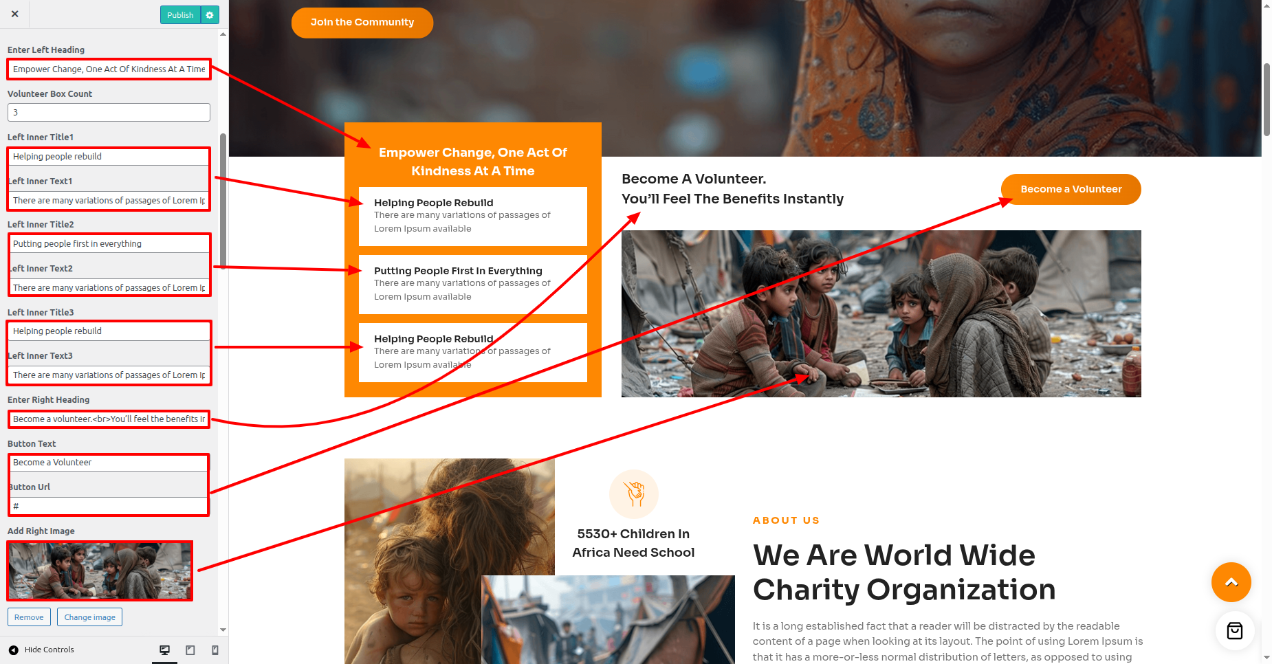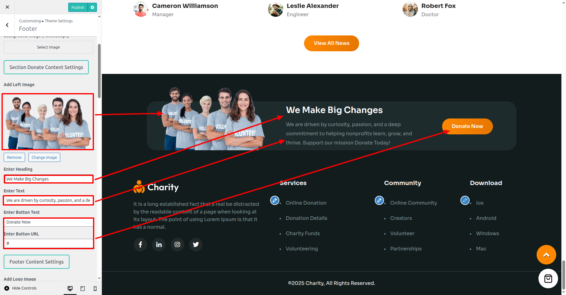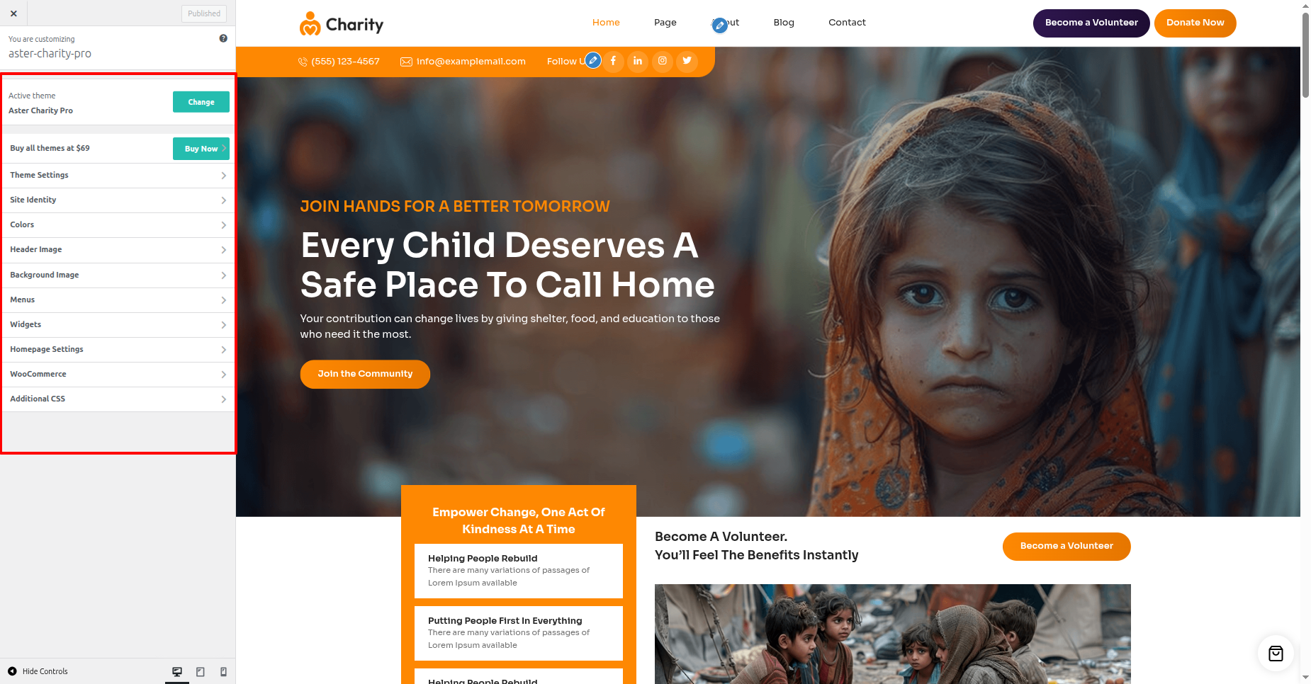 - Proceed to the the Dashboard > Appearance > Customize > Theme Settings > Become Volunteer Section.