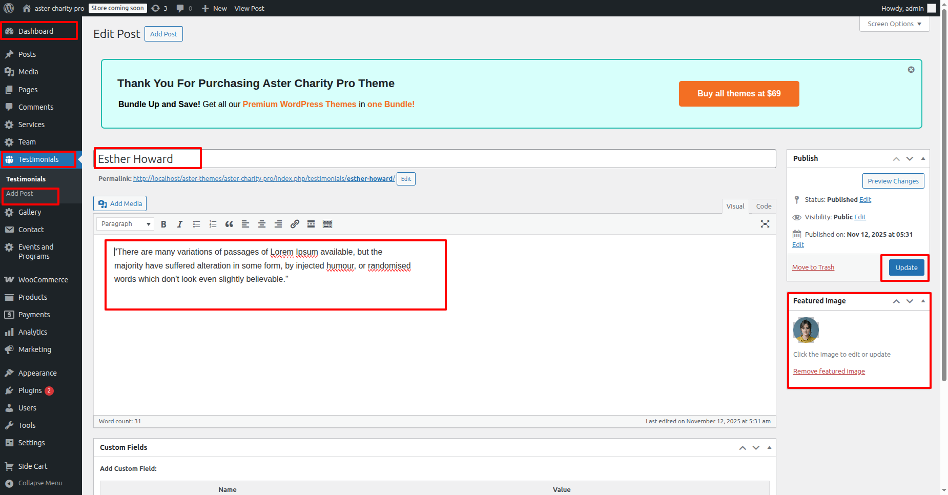 - Proceed to the Dashboard, then go to Testimonial and click Add new post Fill in your details and click Publish button.