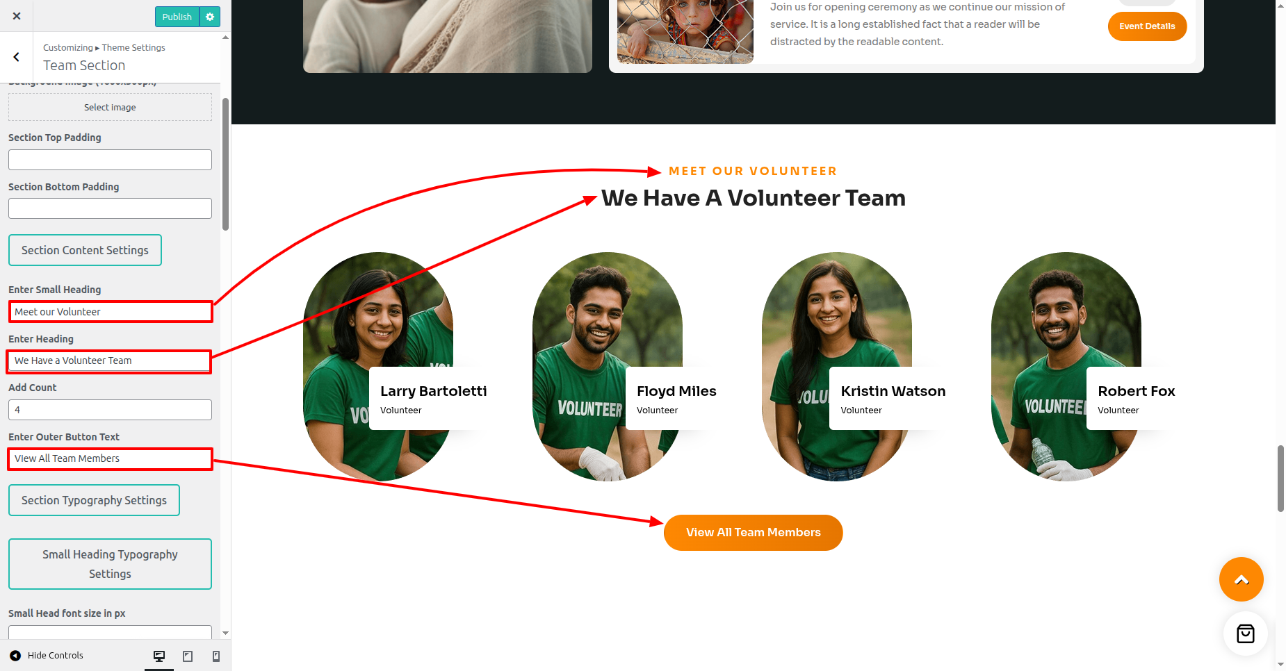 - Proceed to the the Dashboard > Appearance > Customize > Theme Settings > Team Section.