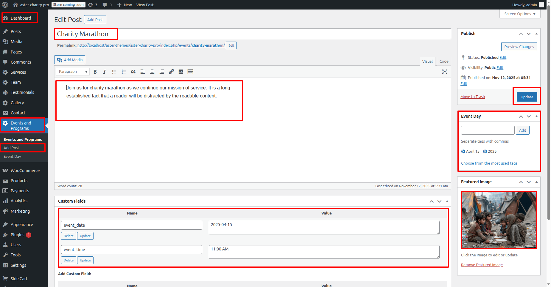 - Proceed to the Dashboard, then go to Events And Programs and click Add new Post Fill in your details and click Publish button.