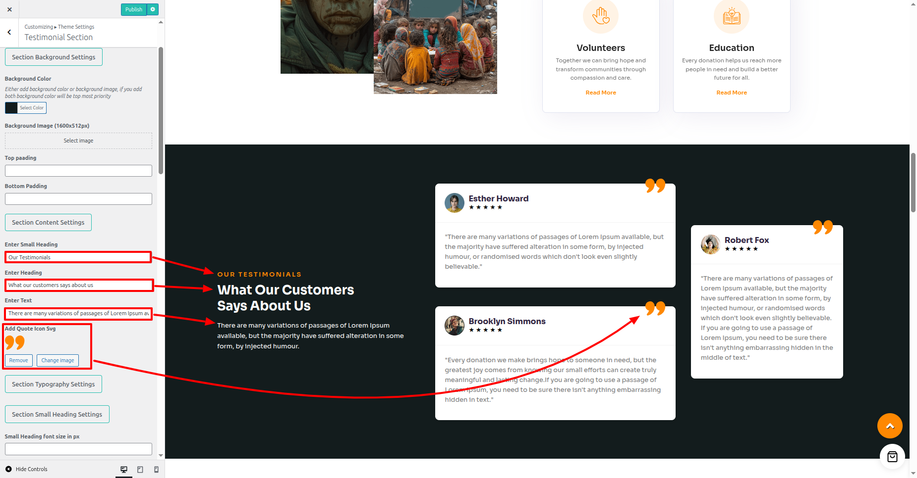 - Proceed to the the Dashboard > Appearance > Customize > Theme Settings > Testimonial Section.