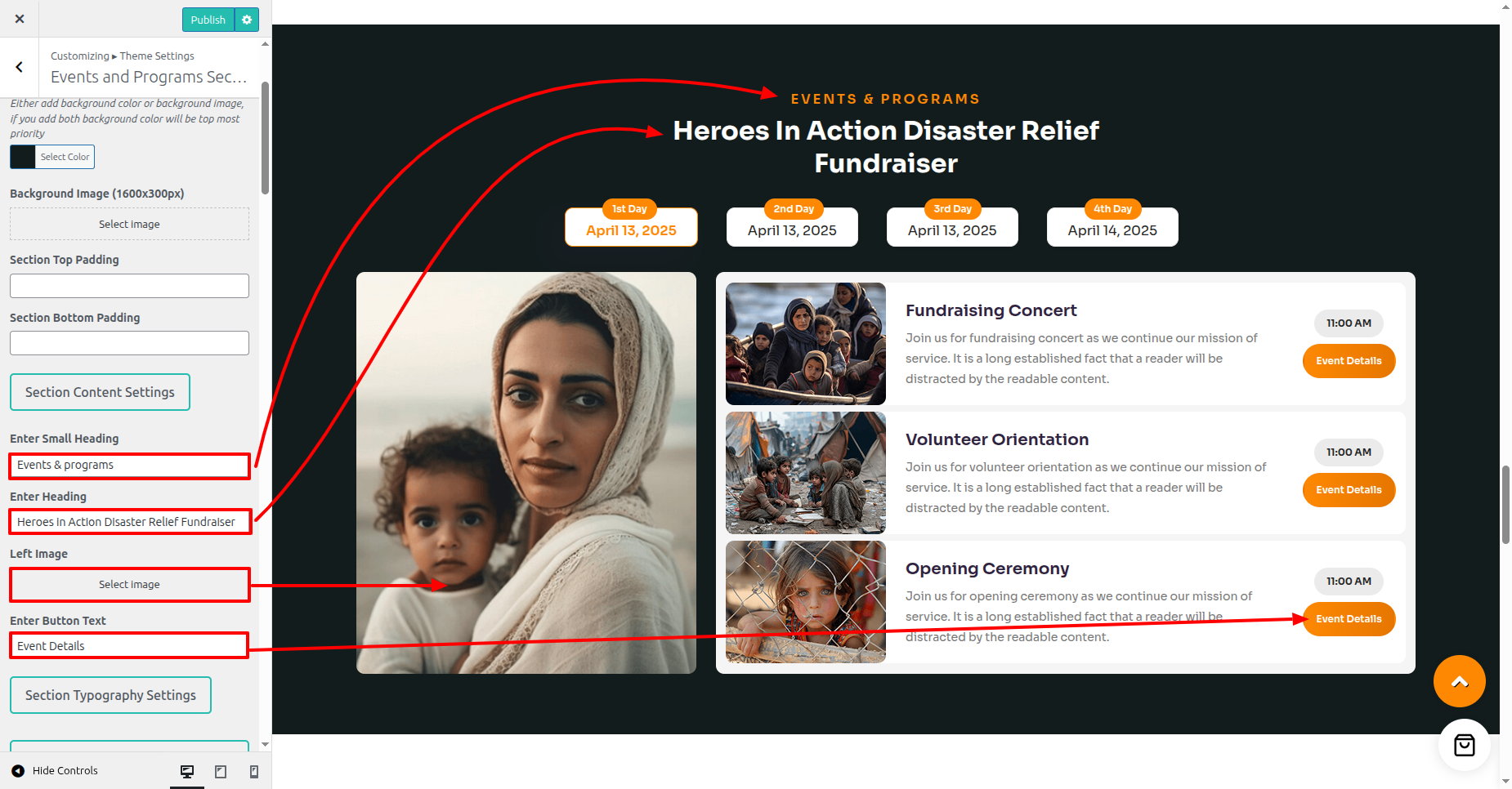 - Proceed to the the Dashboard > Appearance > Customize > Theme Settings > Events And Programs Section.