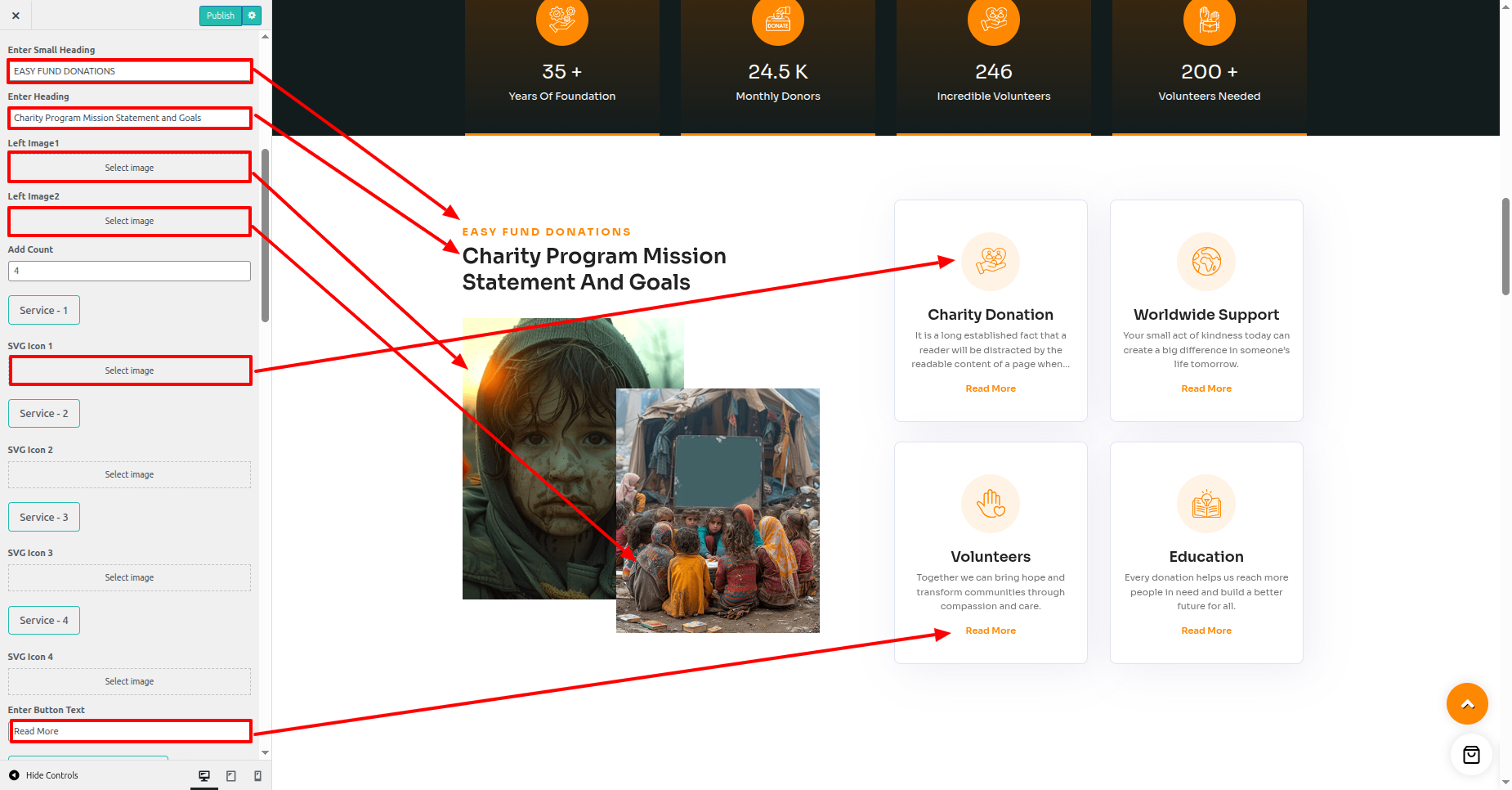 - Proceed to the the Dashboard > Appearance > Customize > Theme Settings > Services Section.