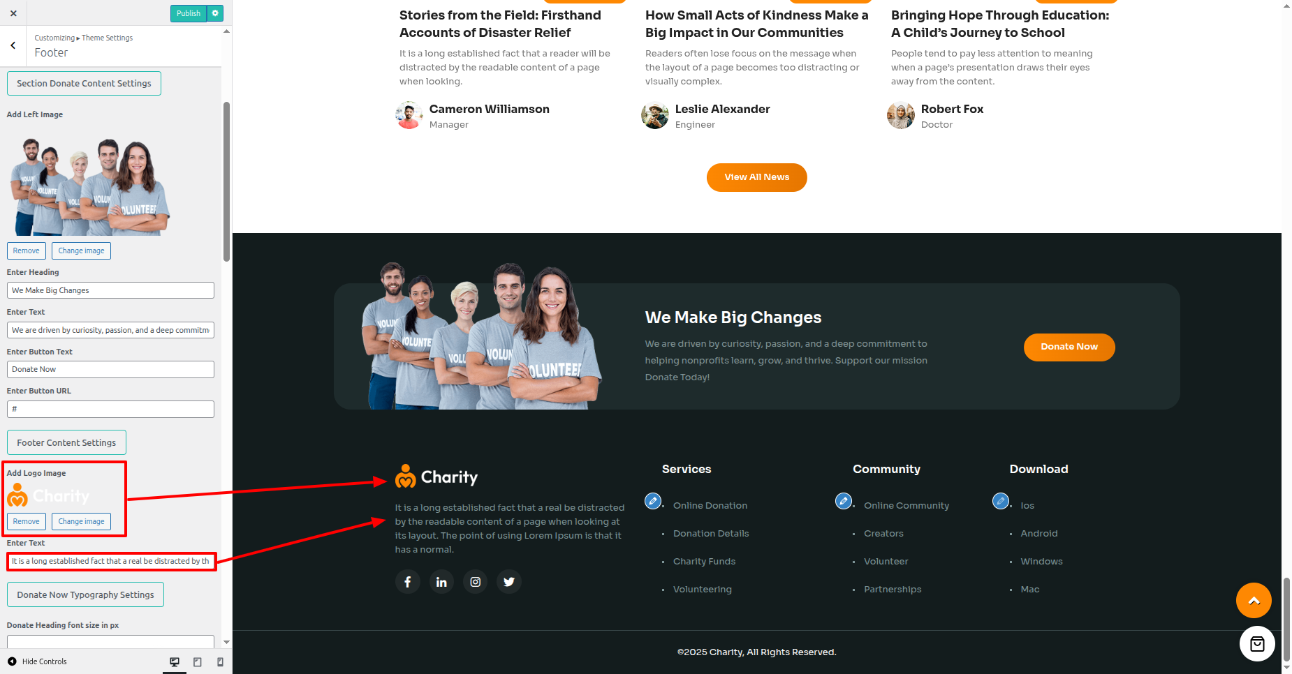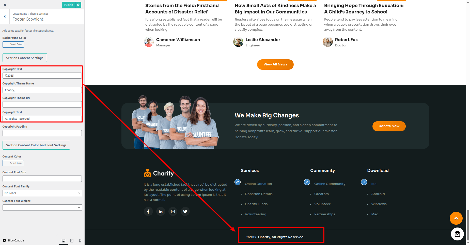 - Proceed to the the Dashboard > Appearance > Customize > Theme Settings > Copyright.