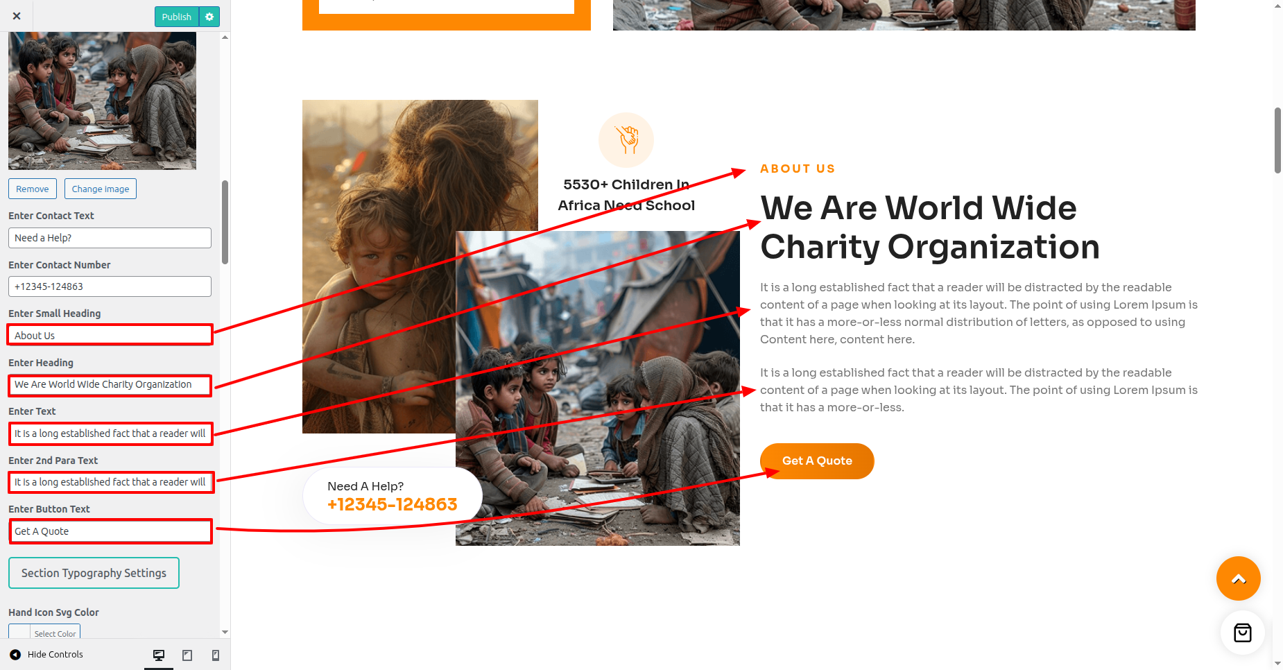 - Proceed to the the Dashboard > Appearance > Customize > Theme Settings > About Us Section.