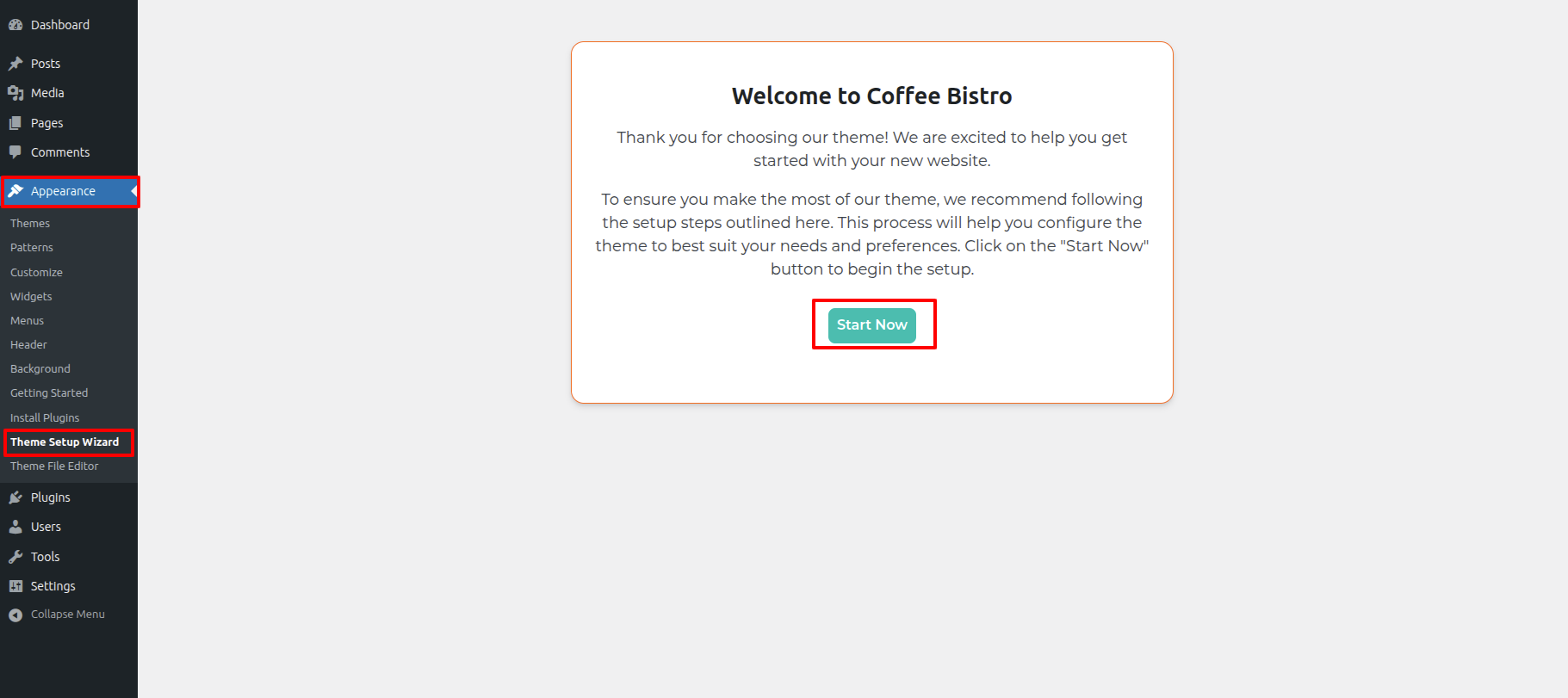 - Hit up the the Dashboard > Appearance > Theme Setup Wizard