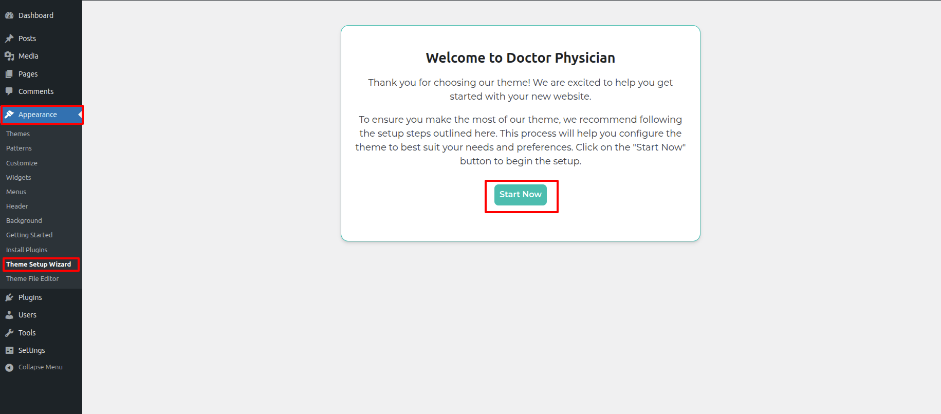 - Hit up the the Dashboard > Appearance > Theme Setup Wizard