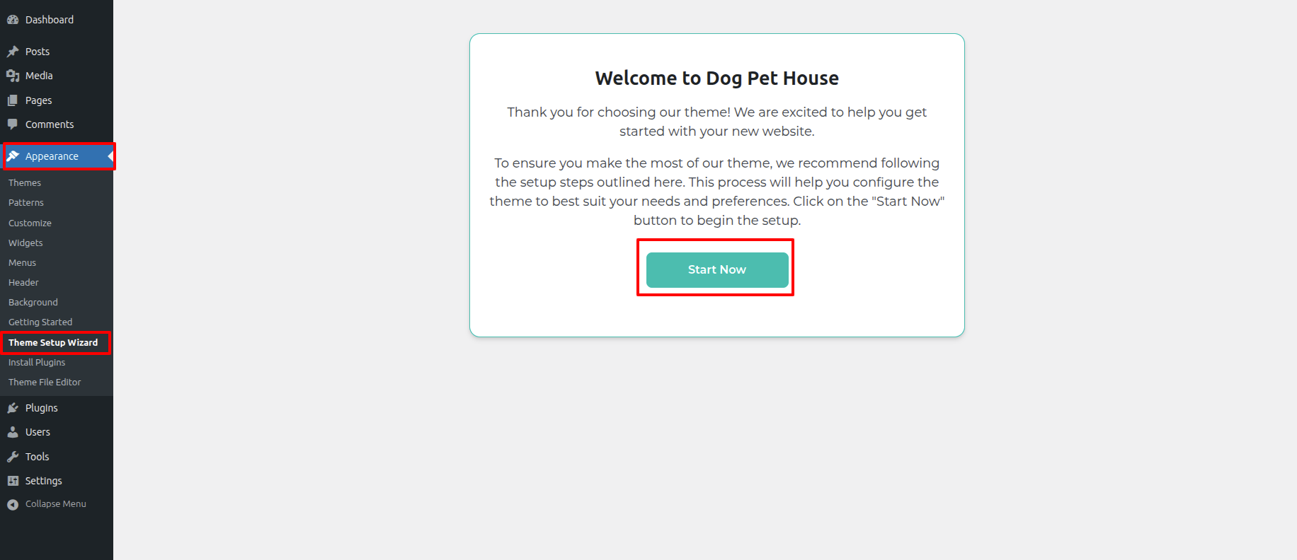 - Hit up the the Dashboard > Appearance > Theme Setup Wizard