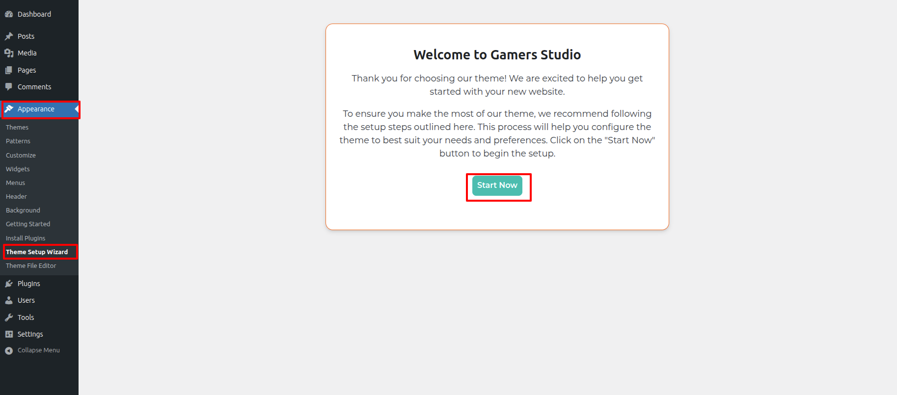 - Hit up the the Dashboard > Appearance > Theme Setup Wizard