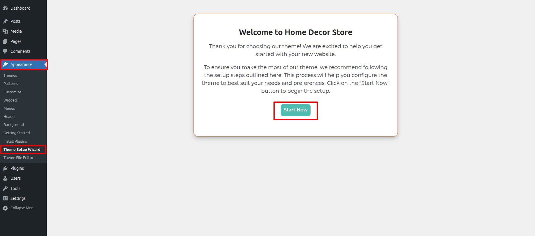 - Hit up the the Dashboard > Appearance > Theme Setup Wizard