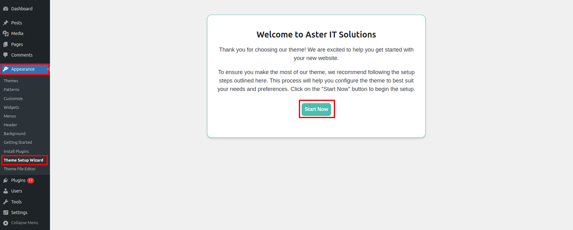 - Hit up the the Dashboard > Appearance > Theme Setup Wizard