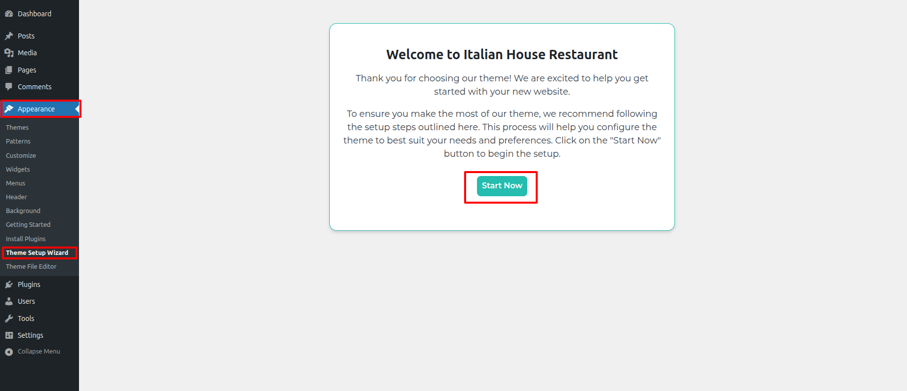 - Hit up the the Dashboard > Appearance > Theme Setup Wizard
