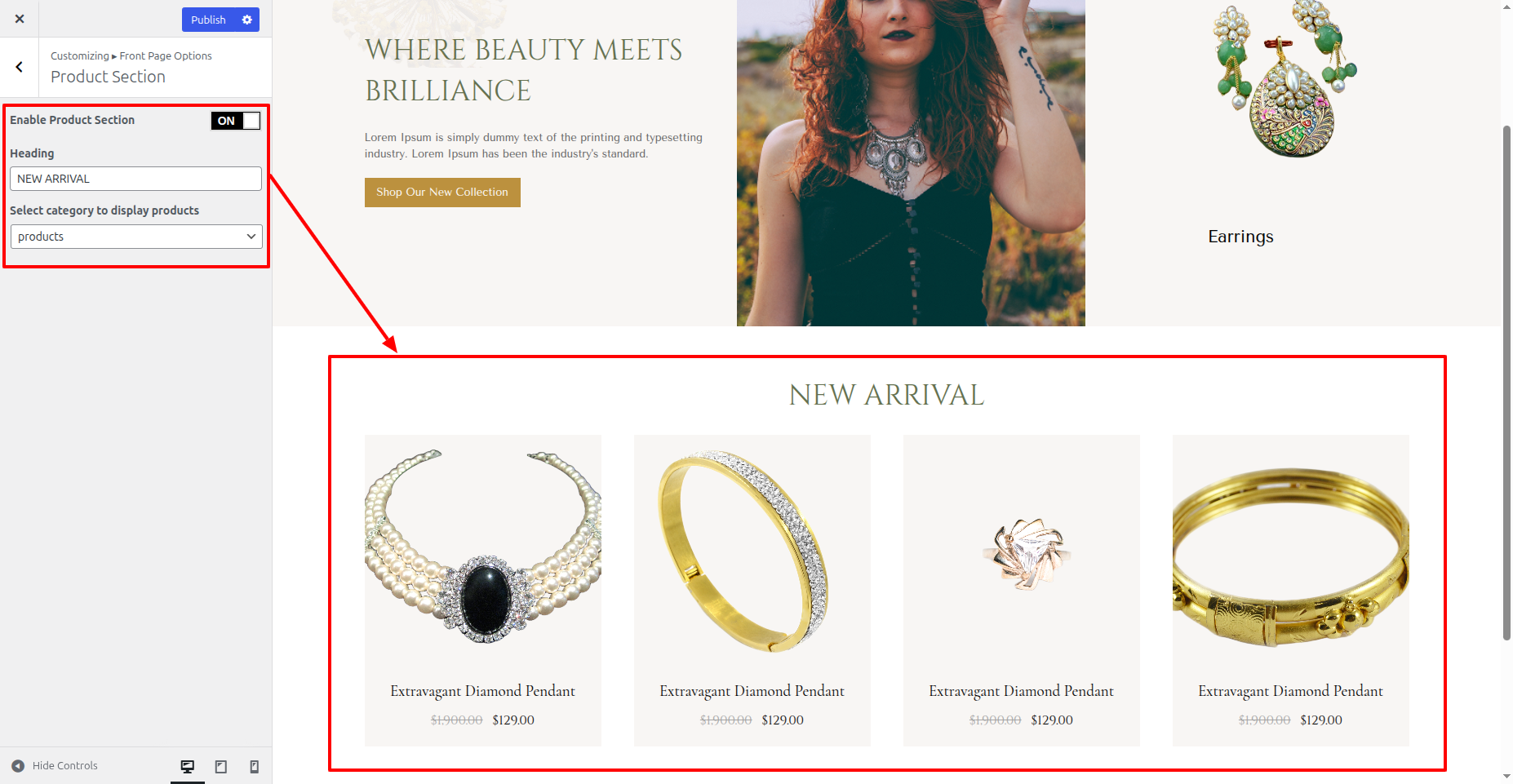 - Hit up the the Dashboard > Appearance > Customize > Front Page Options > Product Section.