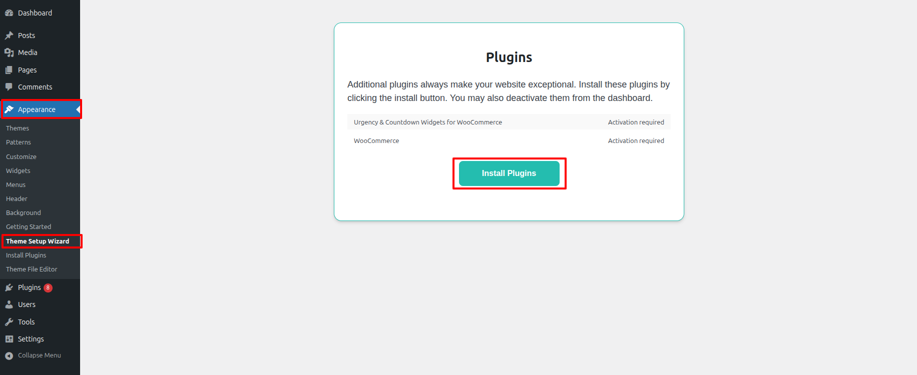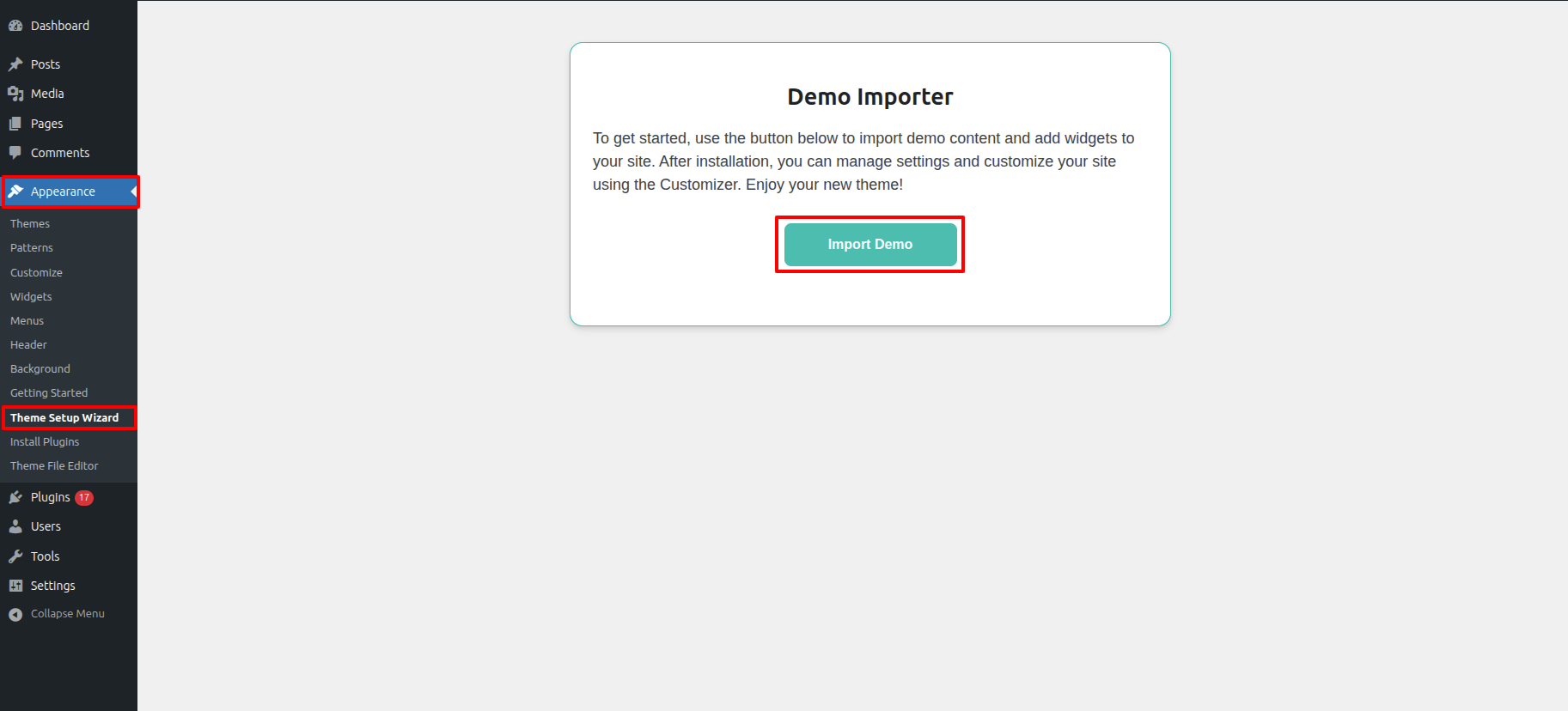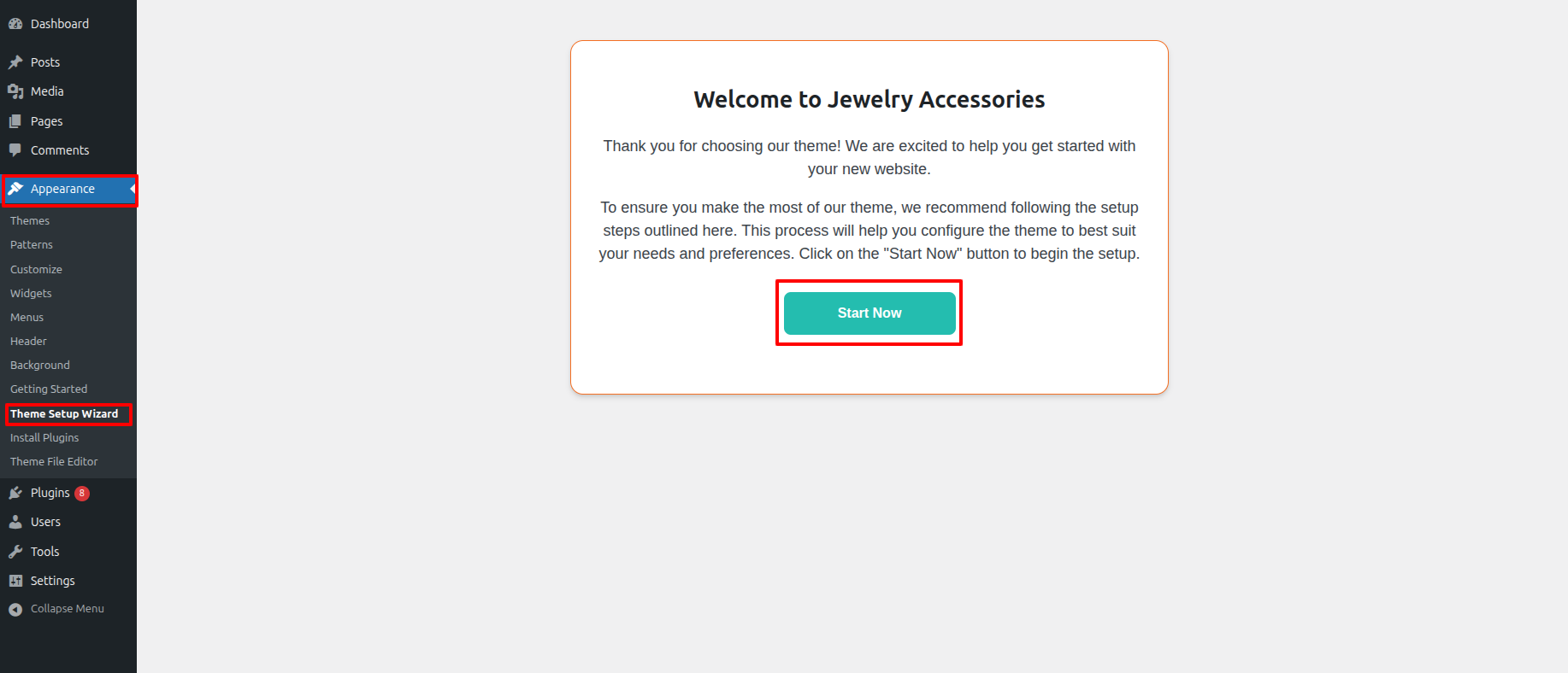 - Hit up the the Dashboard > Appearance > Theme Setup Wizard