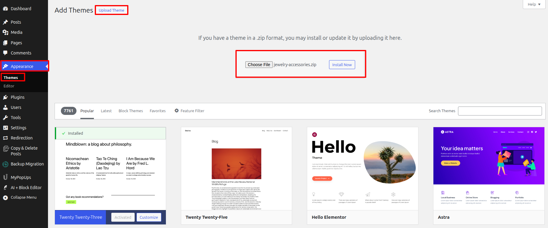 This technique of uploading your theme is something you might want to acknowledge if you have an FTP client installed (like FileZilla) and recognize the login credentials for the server hosting your website.