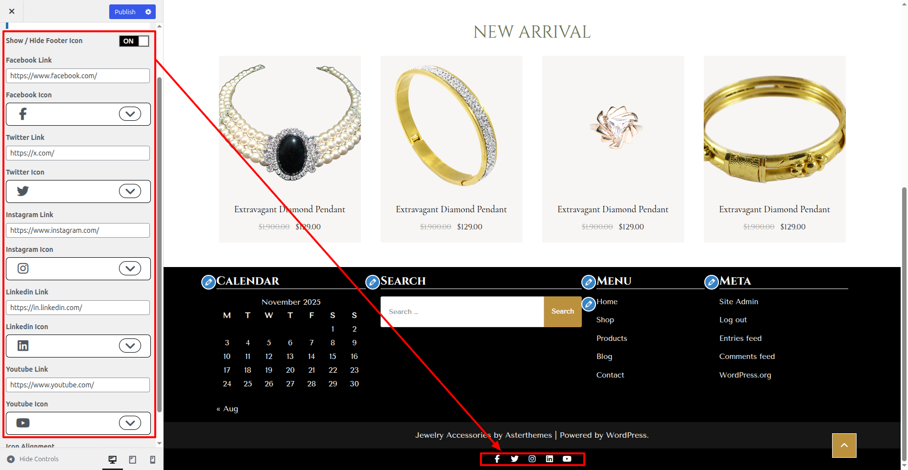 - Hit up the the Dashboard > Appearance > Customize > Theme Options > Footer Social Icons.