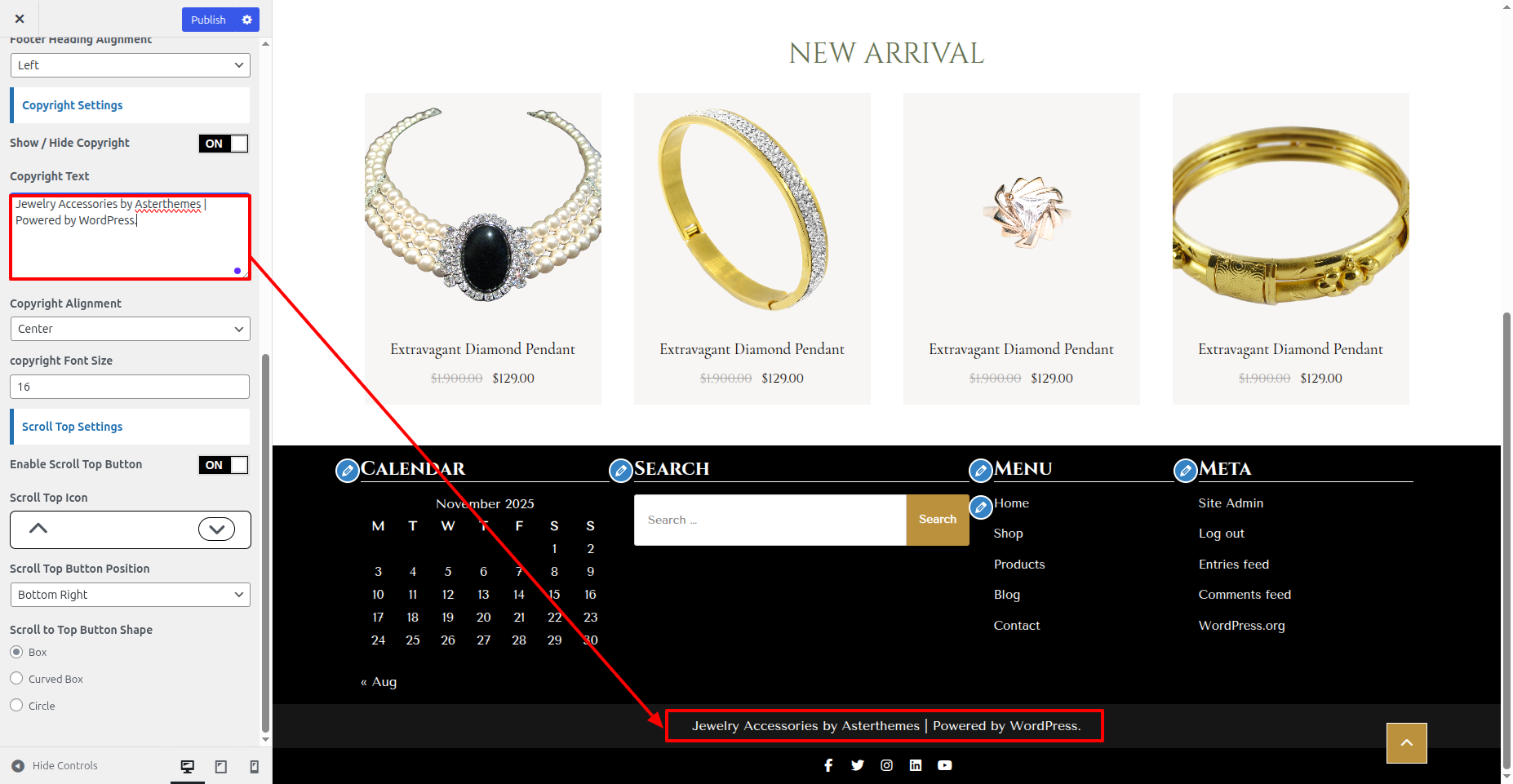 - Hit up the the Dashboard > Appearance > Customize > Theme Options > Footer Options.
