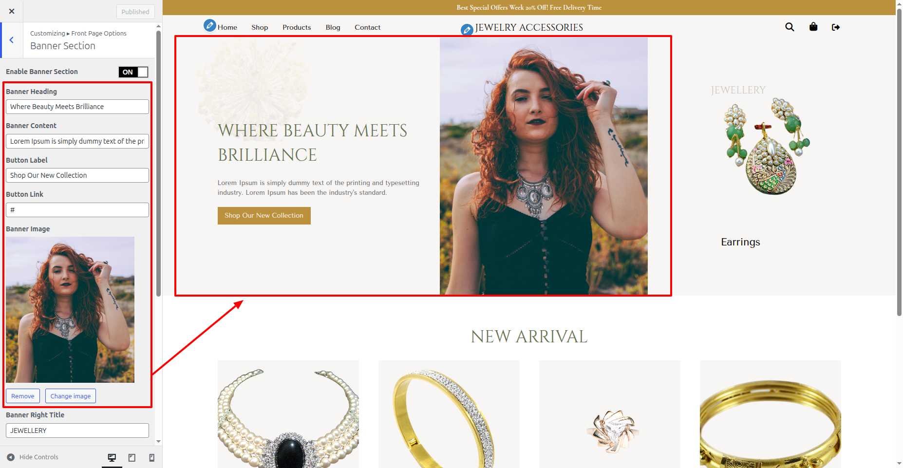 - Hit up the the Dashboard > Appearance > Customize > Front Page Options > Banner Section.