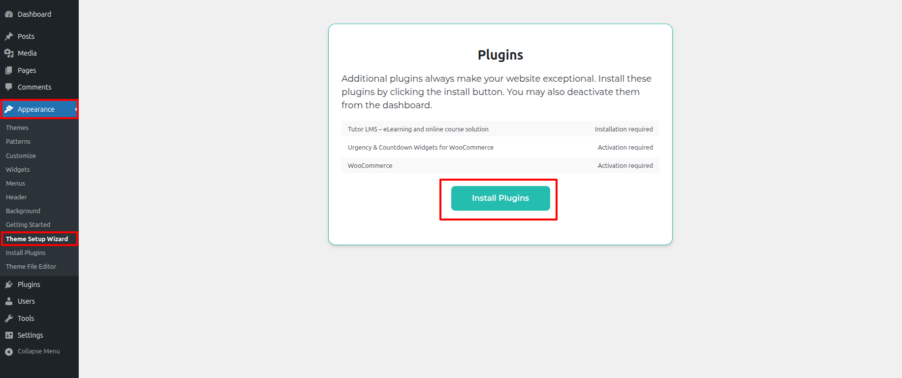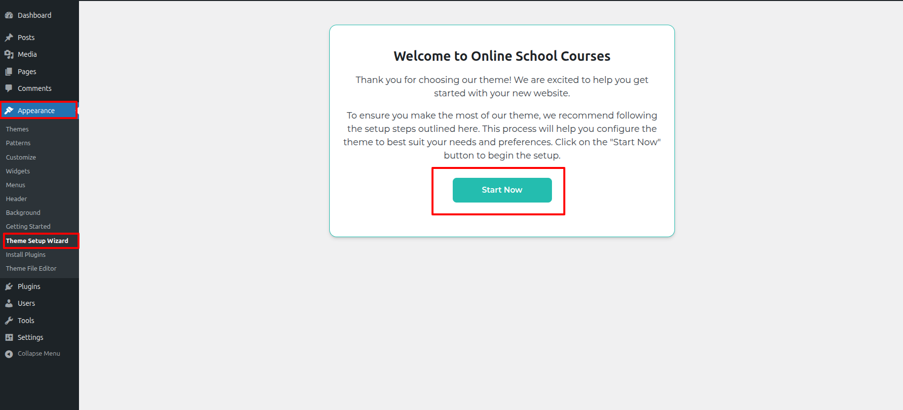 - Hit up the the Dashboard > Appearance > Theme Setup Wizard