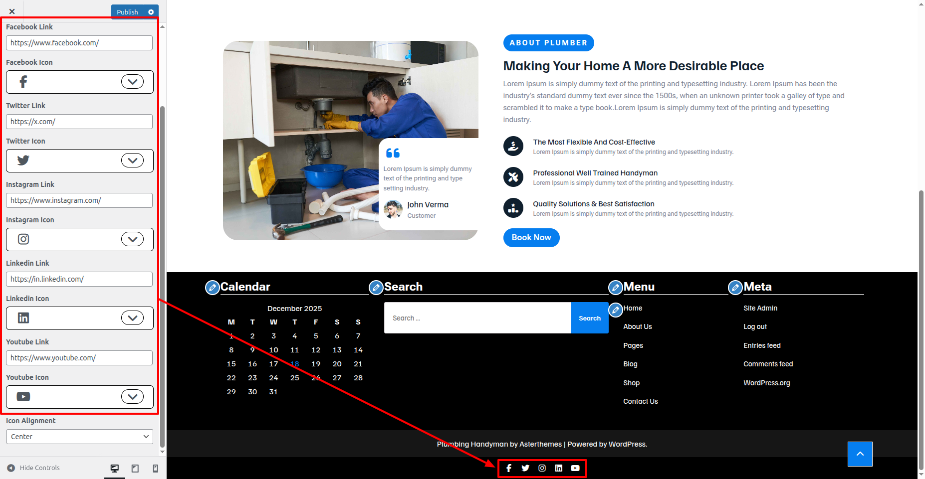 - Hit up the the Dashboard > Appearance > Customize > Theme Options > Footer Social Icons.