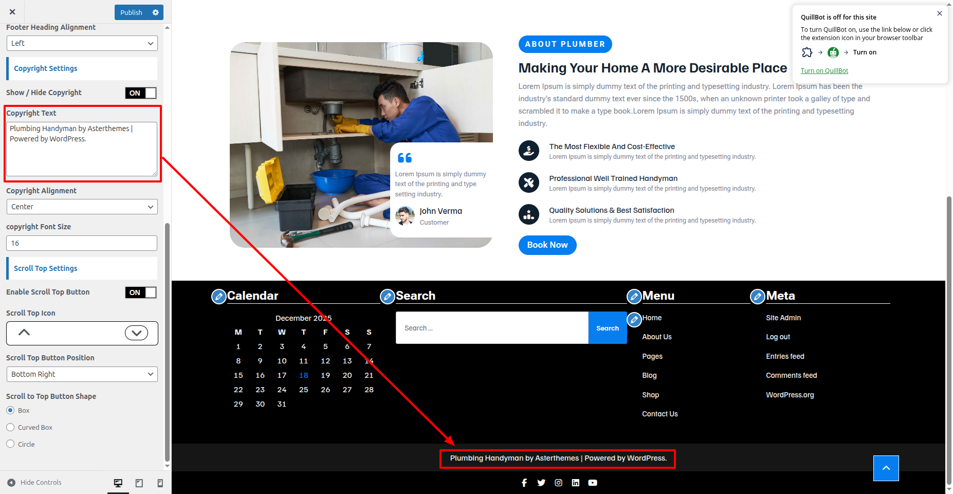 - Hit up the the Dashboard > Appearance > Customize > Theme Options > Footer Options.