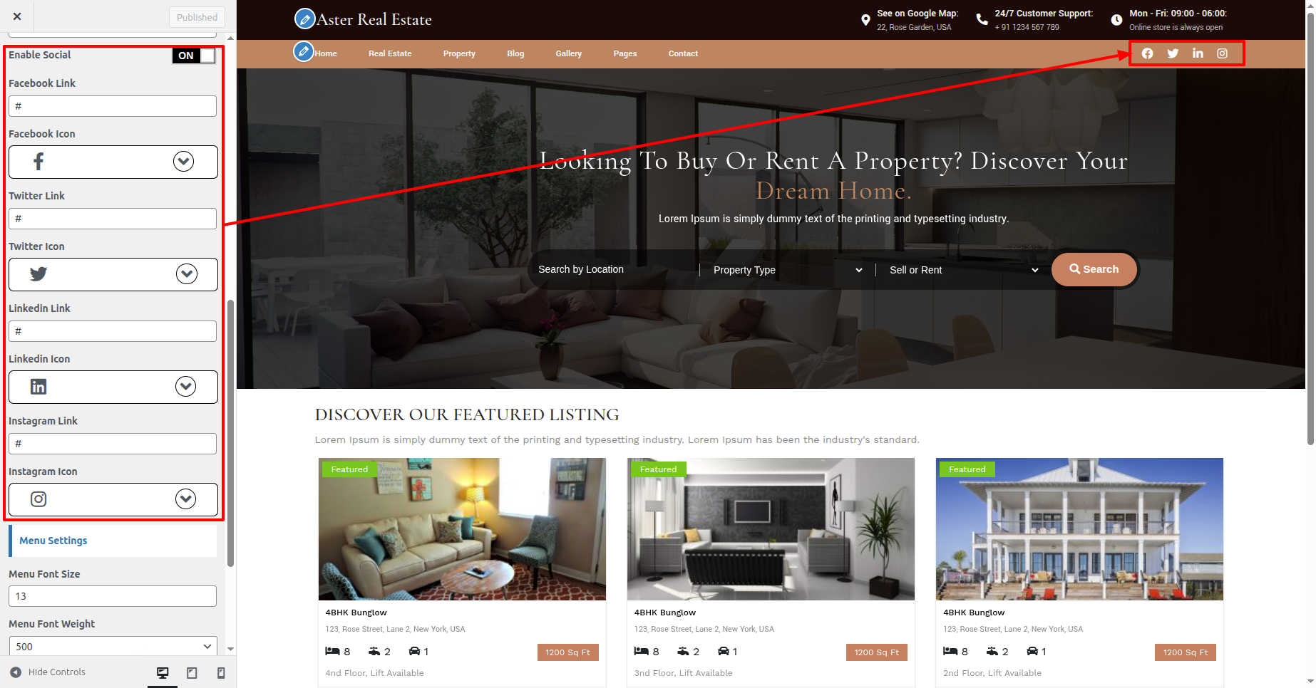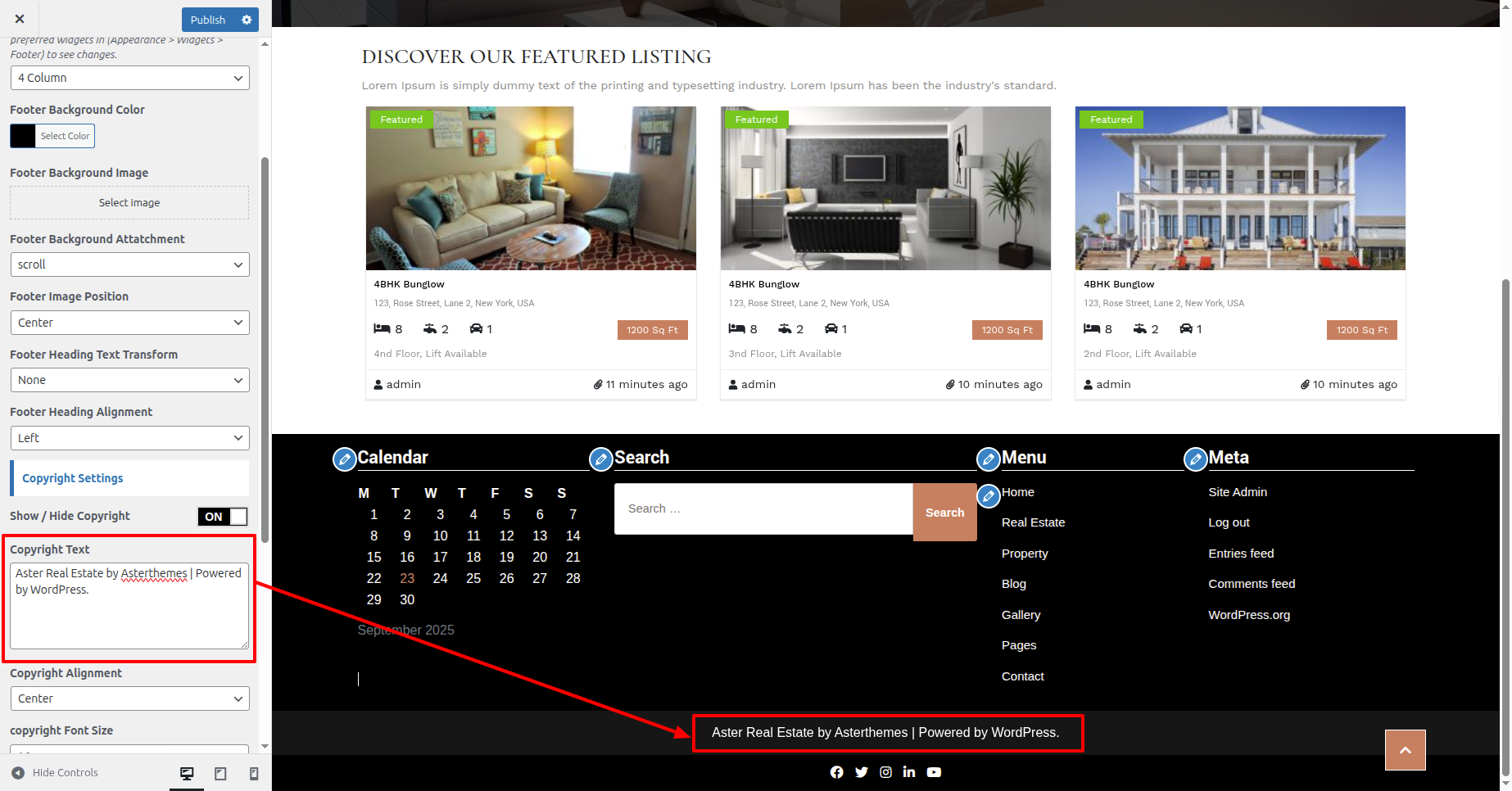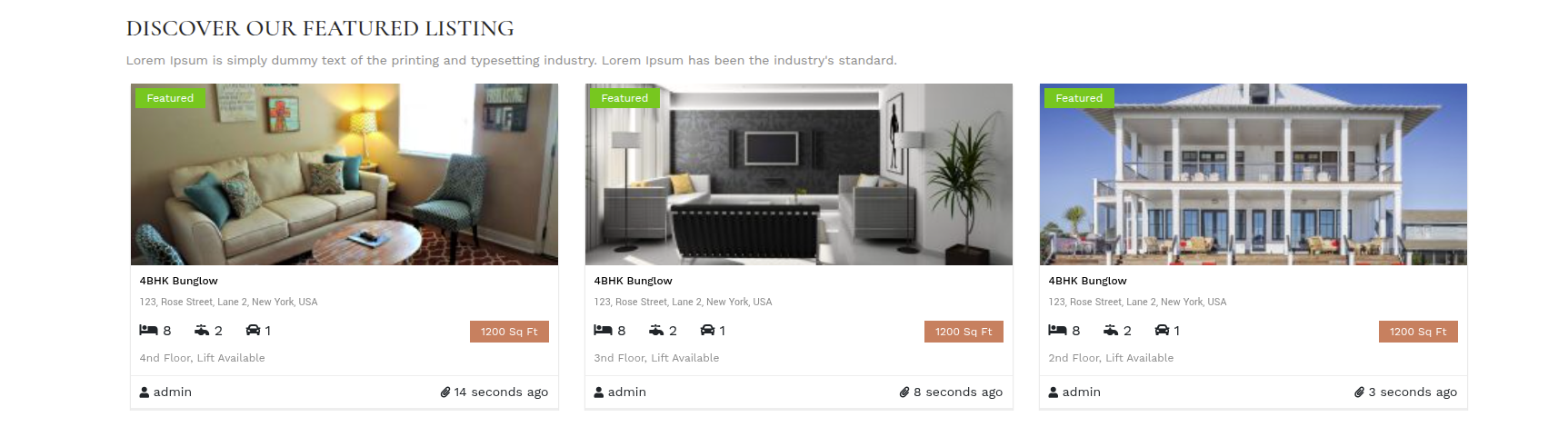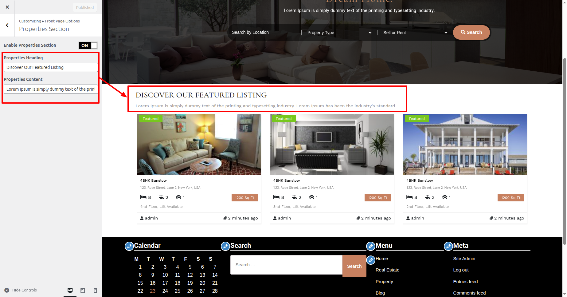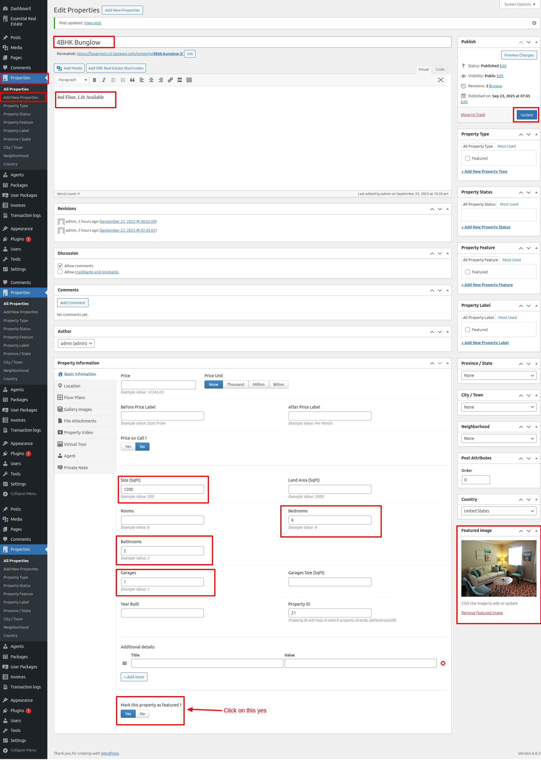 - Hit up the the Dashboard > Properties > Add New Properties > Add title, Content, Size, Bedrooms, Bathrooms, Garages, Featured Image, Location.