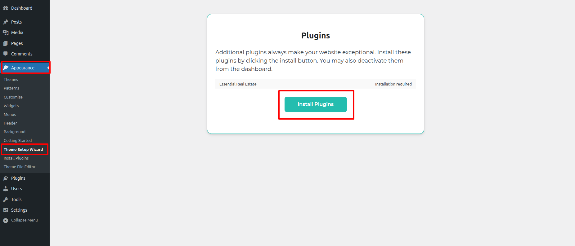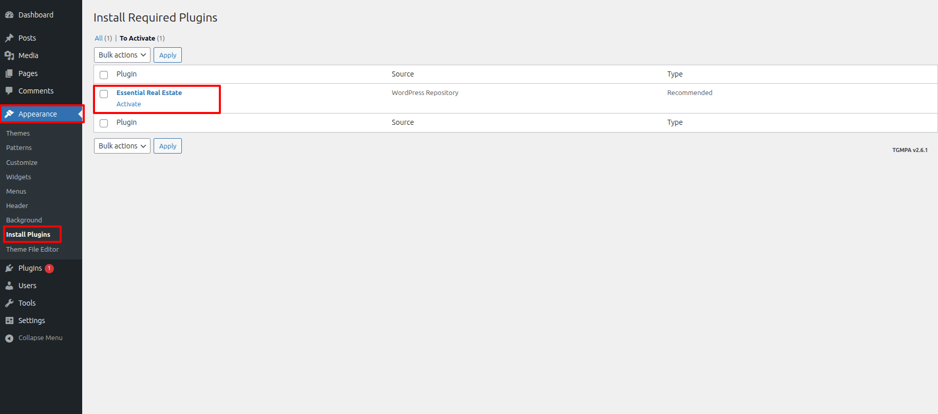 - Hit up the the Dashboard > Appearance > Install Plugins > Install Required Plugins.